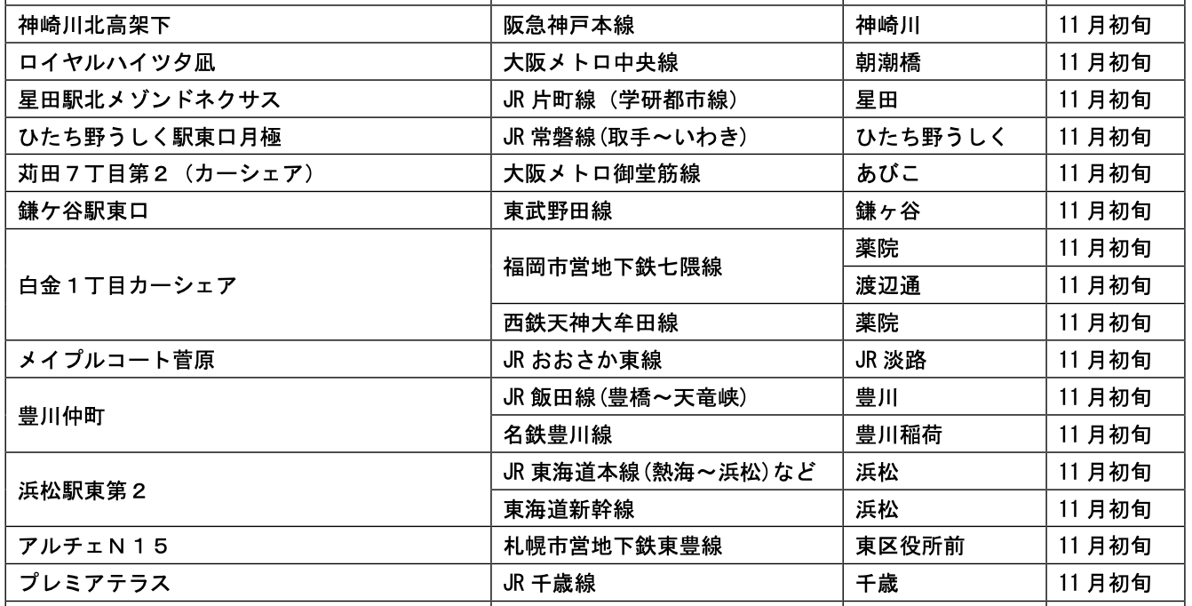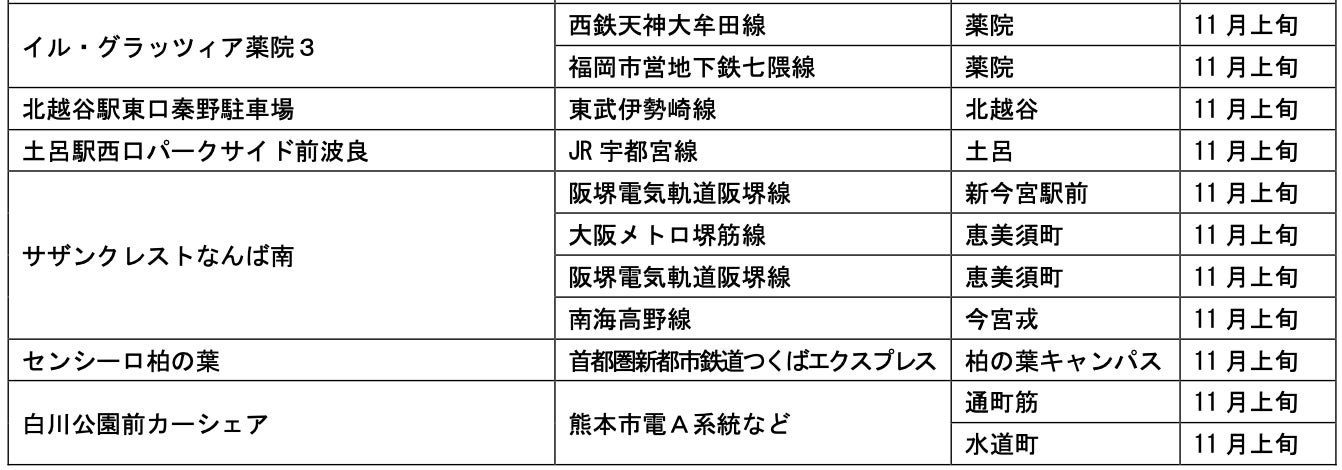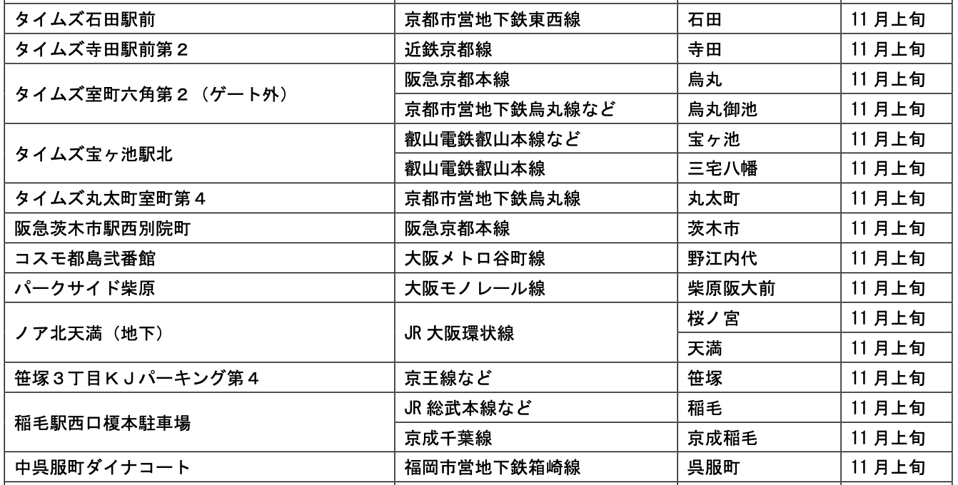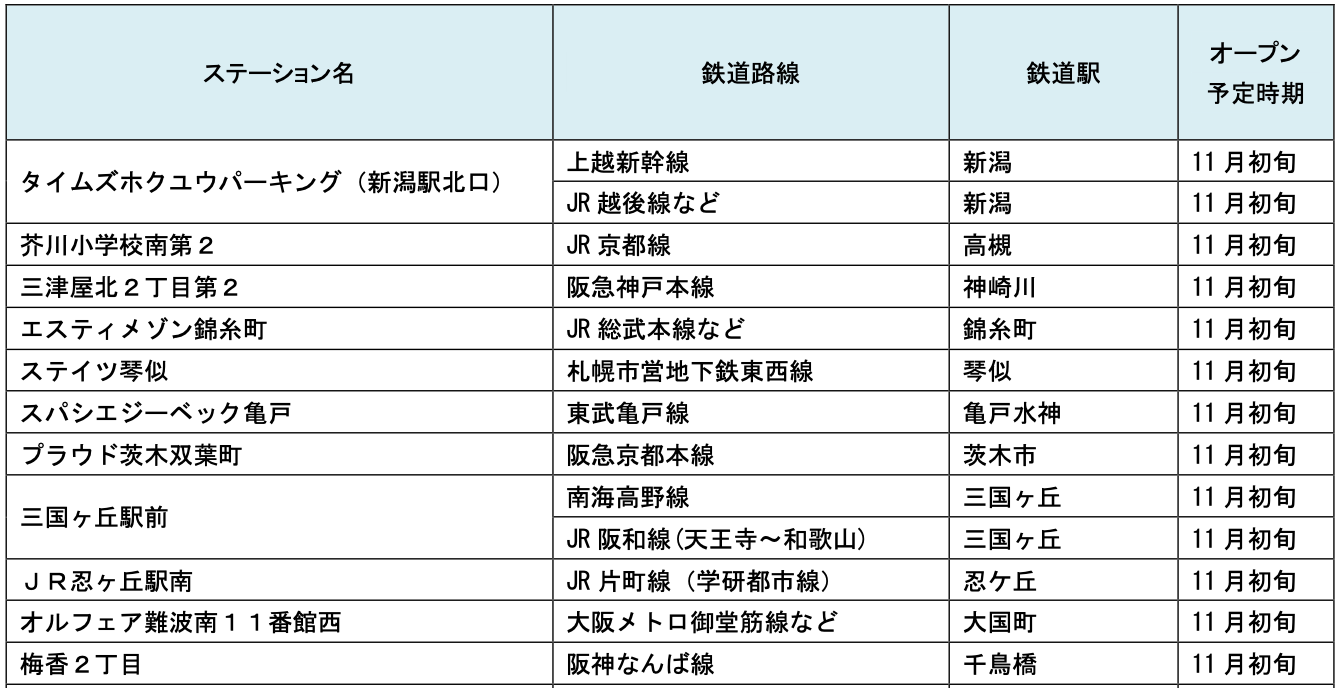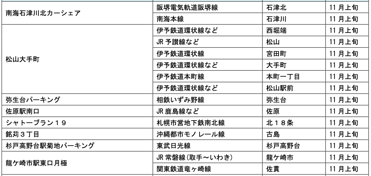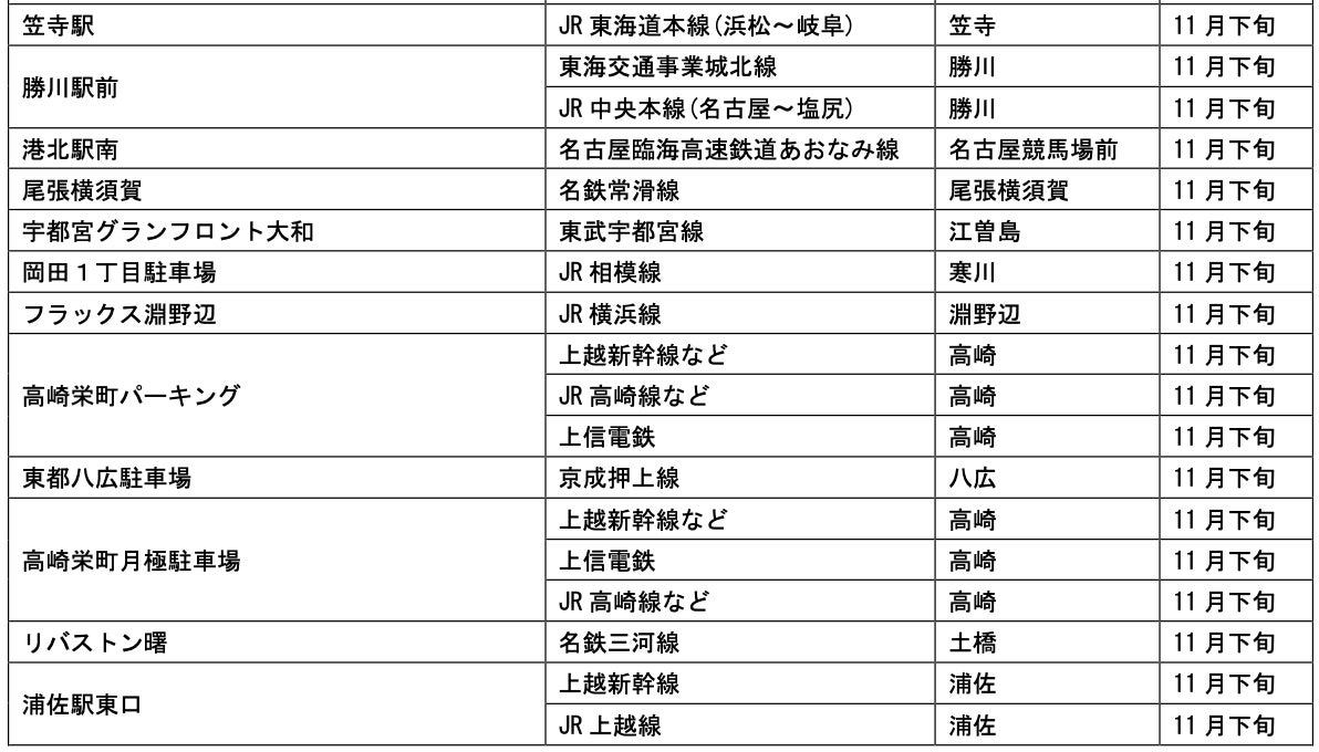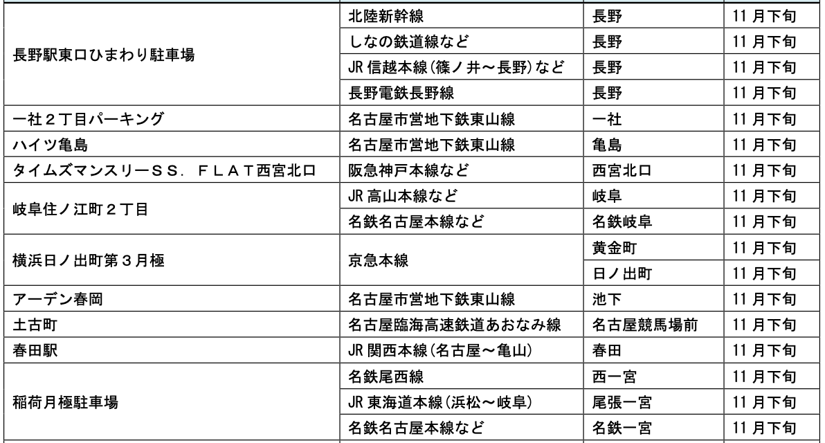 11月にオープンおよびオープン予定の「パーク&ライド」が可能な駐車場は19件、「レール&カーシェア」が可能なステーションは121件です。