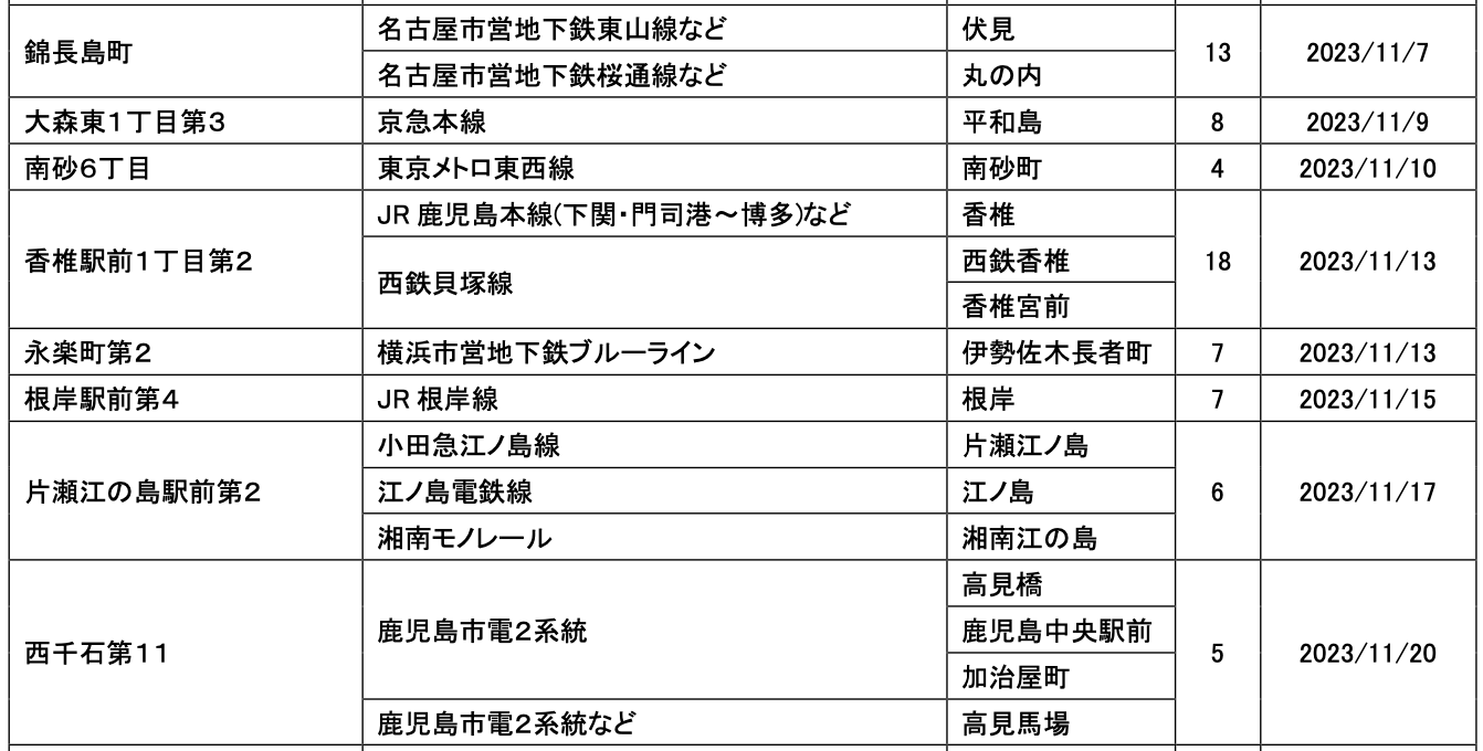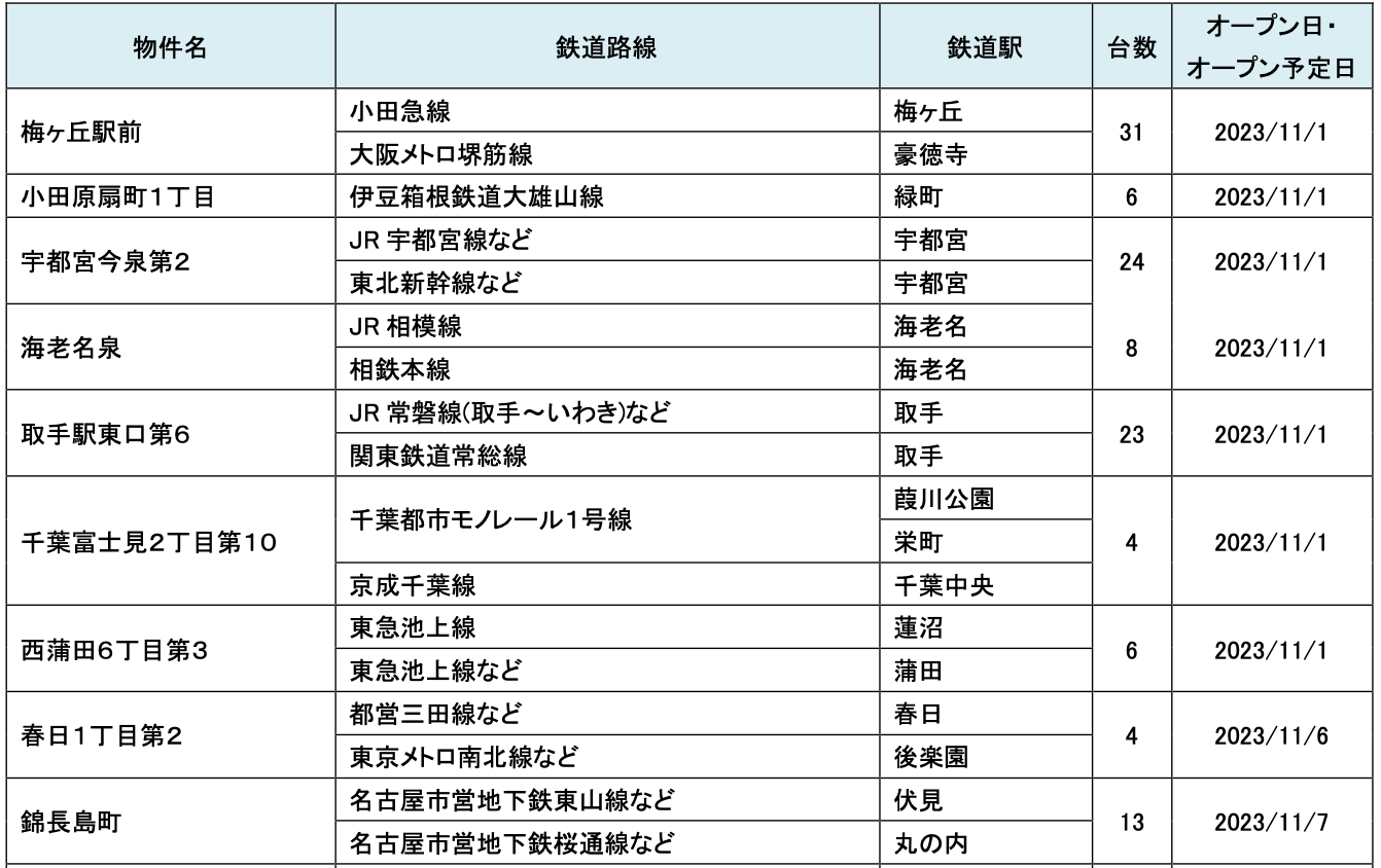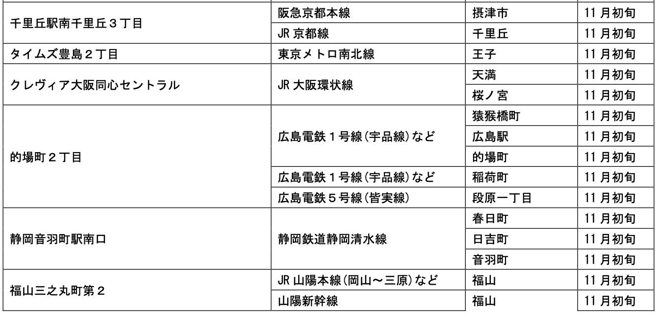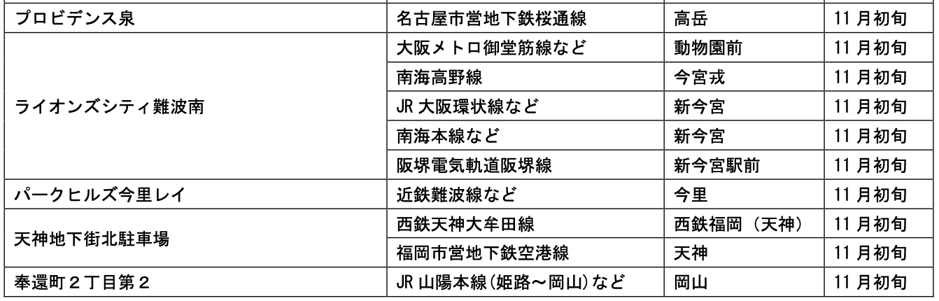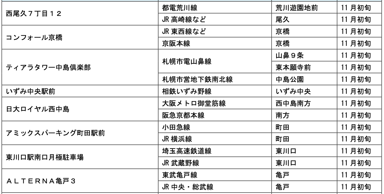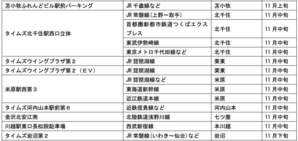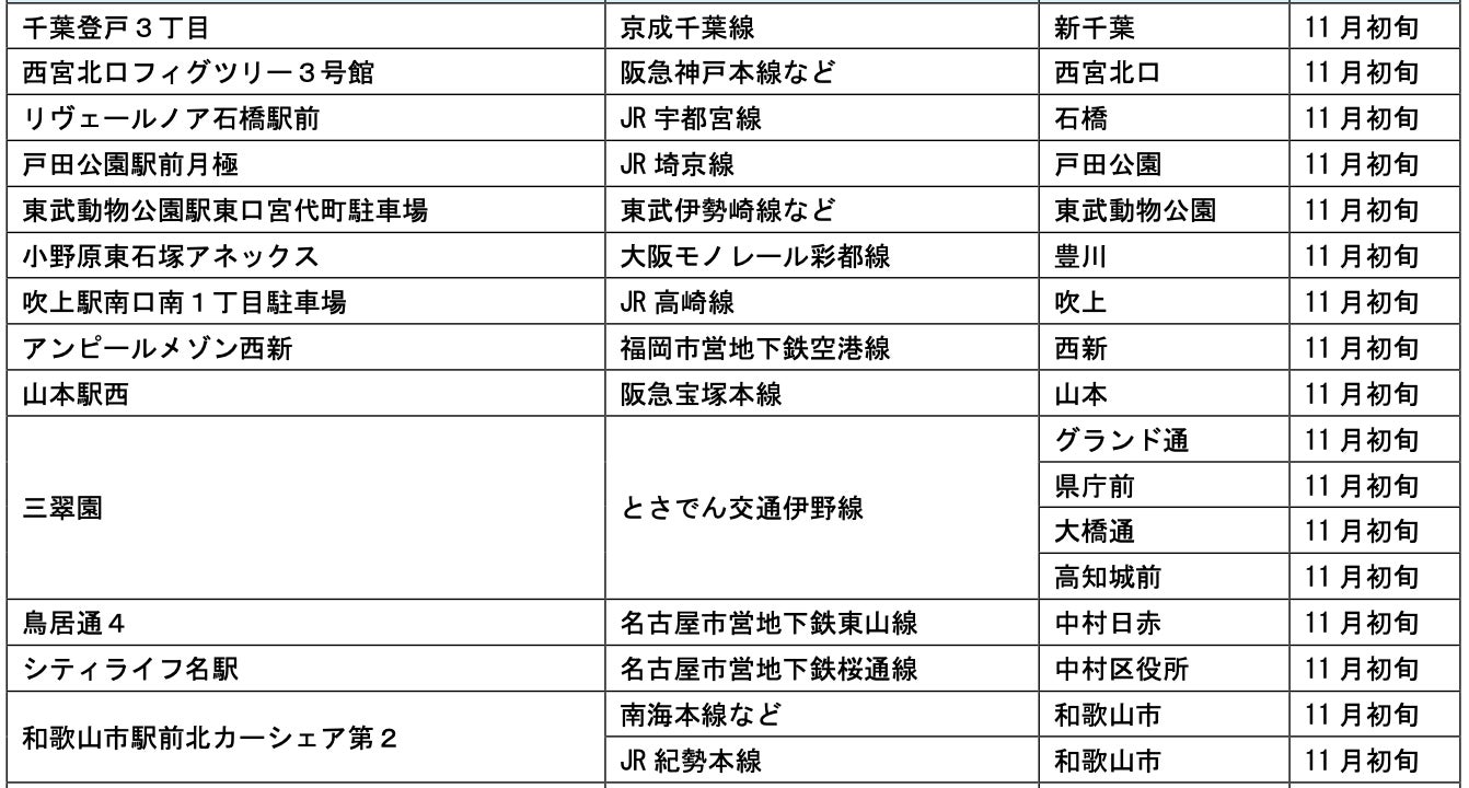 11月にオープンおよびオープン予定の「パーク&ライド」が可能な駐車場は19件、「レール&カーシェア」が可能なステーションは121件です。