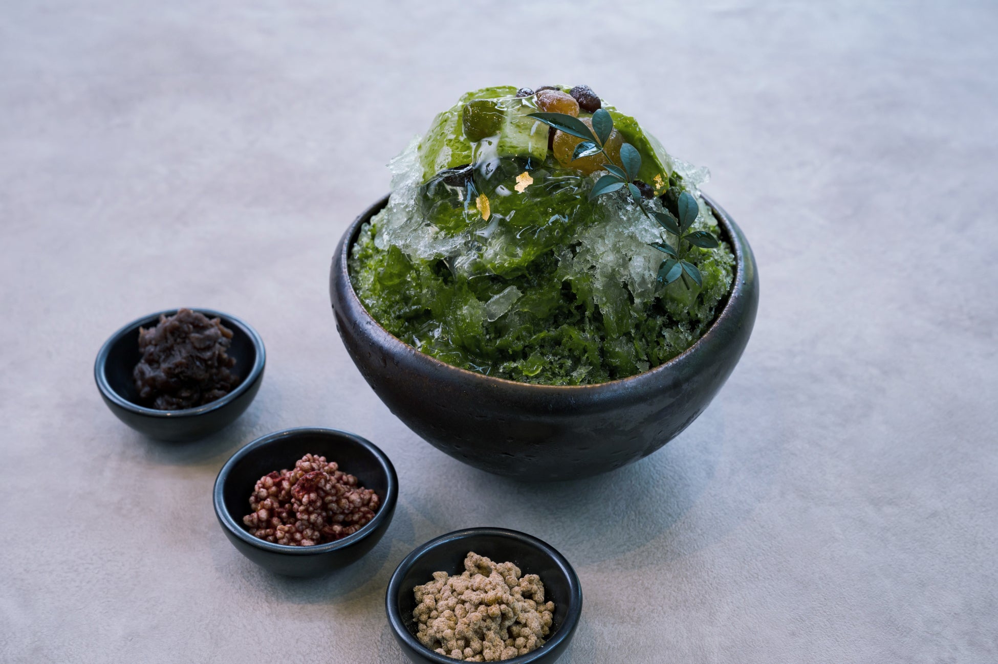 コク深く甘みと旨みの強い福岡県産「八女抹茶」を贅沢に使用したかき氷。白餡を使用したまろやかな抹茶ソースと、抹茶とミルクの葛をご一緒にお召し上がりいただけます。別添えの2色のポン菓子と自家製あんこを組み合わせ、食感や味わいの変化をお愉しみください。