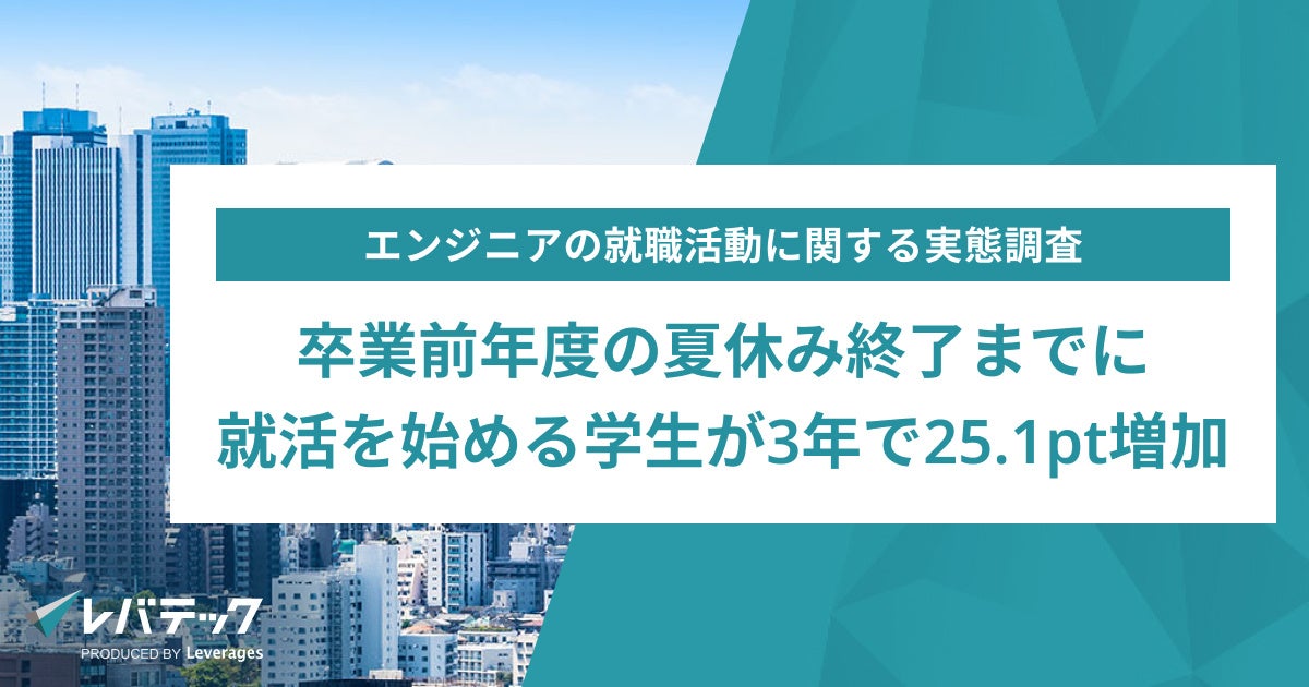 今回の調査結果から、コロナ禍以前と比較すると大学3年次・大学院1年次の夏休みが終わるまでに就職活動を開始する学生が増加していることが分かりました。新型コロナウイルスの蔓延によって就職活動のオンライン化が進み、自宅から気軽に説明会や面接を受けることができるようになったことによって、就職活動を始めるハードルが下がったことが要因の一つとして考えられます。新卒のエンジニア採用を行う企業にとって、学生と早期に接点を持つ重要性が増していると言えるでしょう。