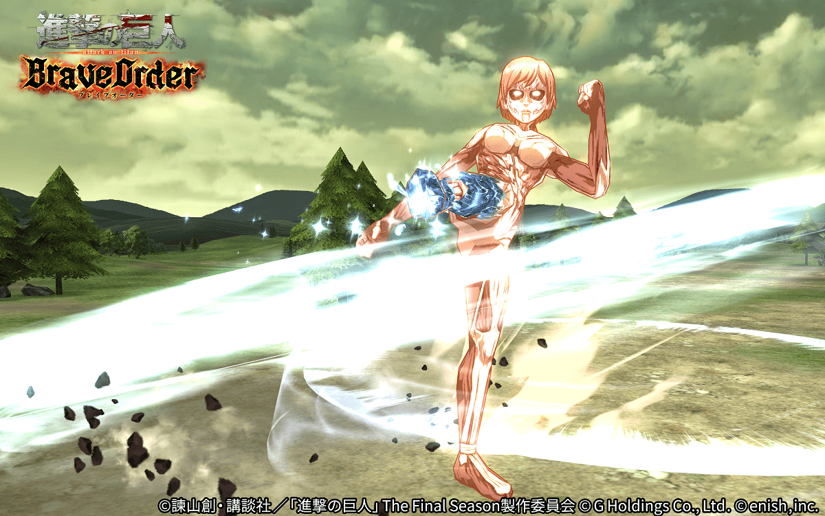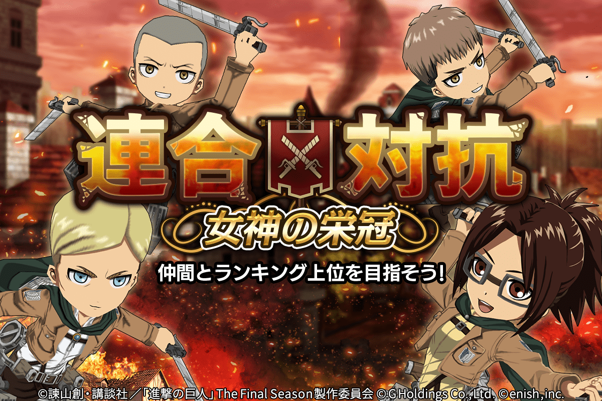 株式会社enish(本社:東京都港区、代表取締役社長:安徳 孝平、以下enish)は、アニメ『進撃の巨人』のスマートフォンゲーム最新作「進撃の巨人Brave Order」にて、巨人殲滅戦に新たな脅威となる「謎の巨人 女型」を追加いたしました。迫りくる新巨人を殲滅し豪華報酬を獲得せよ!また、連合の団員とともに協力して連合の総戦闘力で競い合うランキング&ミッションイベント「第2回連合対抗~女神の栄冠~」を開催!更に、本日より【調査兵団マント】エルヴィン・スミスなどの団員がピックアップされた「金背景付き団員ピックアップガチャ」も同時開催!その他、最新情報はゲーム公式サイト・ゲーム公式Twitterアカウントにて随時公開して行きますので、ぜひご覧ください。