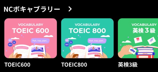 NCボキャブラリーは、オリジナルの単語帳を自作して語彙力を強化できる学習コンテンツです。英単語やフレーズを効率良く覚えるだけでなく、その使い方も身につけることが可能です。学習コンテンツには、Daily News、TOEIC、英検などのジャンルが取り揃えられており、好きなコースを自由に学ぶことができます。各英単語やフレーズには、例文、イラスト、音声が付いているため、より実践的な学習が可能です。また、スマホ、タブレットに対応しており、時間や場所を選ばずスキマ時間を活用して効率的に学習できます。