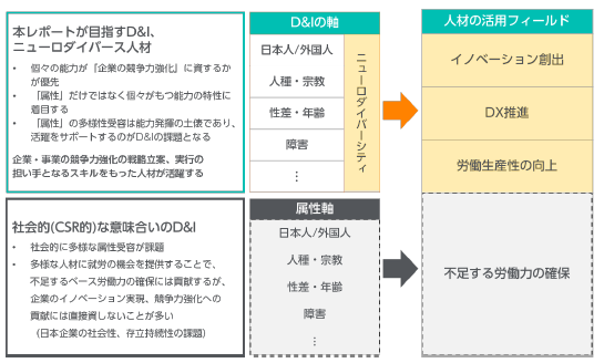 | ニューロダイバース人材とは? ニューロダイバーシティとは「脳多様性」や「神経多様性」などと訳される言葉で、脳や神経には個人レベルでのさまざまな特性の違いがあり、その違いを多様性と捉えて相互に尊重し、社会の中で活かそうとする考え方です。本レポートでは、脳・神経の特性を活かし顕著な成果を上げる人材を「ニューロダイバース人材」と定義しています。ND人材には自閉症スペクトラム障害をはじめとした発達障害の傾向がある人材も多く含まれますが、ニューロダイバーシティの考え方においては、その特性を障害ではなく能力の多様性として捉え、活かしていく視点の転換が重要と言えます。 |