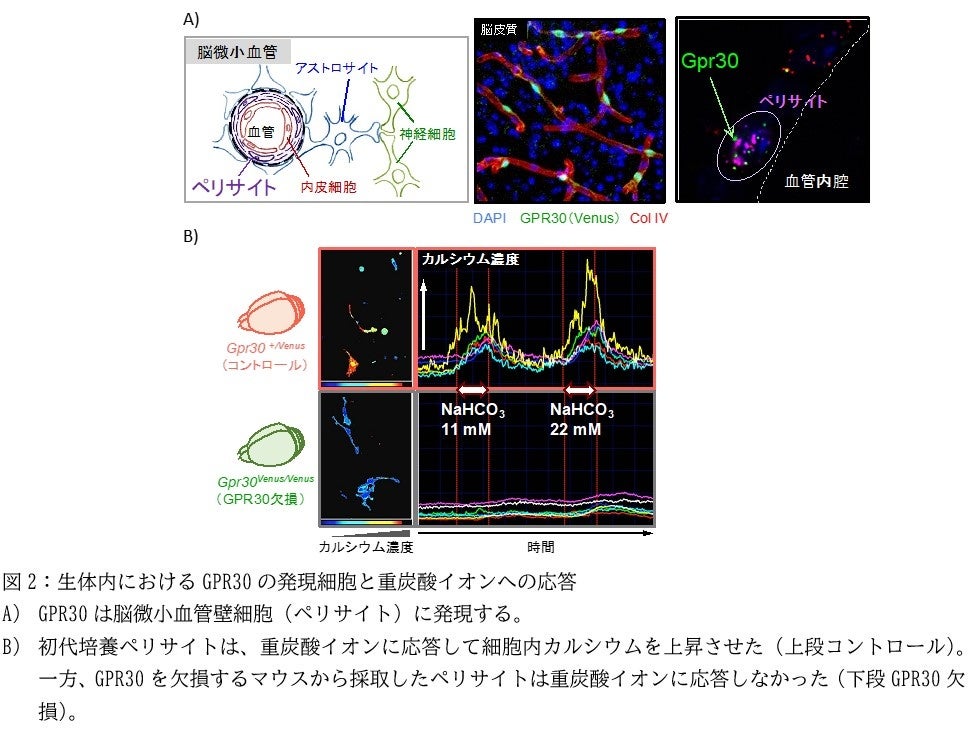 次に研究グループは、GPR30発現細胞で蛍光タンパク質を発現するマウスを作製して全身の臓器を調べ、GPR30が脳の血管壁細胞に発現していることを見出しました(図2A)。さらに、このマウスから単離したペリサイトおよび血管平滑筋細胞が、GPR30依存的に重炭酸ナトリウムに反応して細胞内カルシウムを上昇させることを証明しました(図2B)。