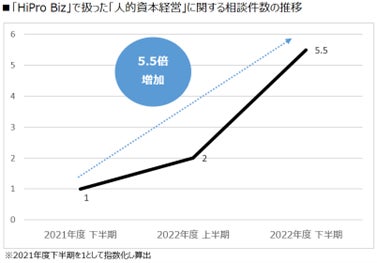 「HiPro Biz」では、「人的資本可視化指針」が発表された2022年8月以降、企業から「人的資本経営」に関する相談が急増。2022年度下半期(2022年9月~2023年3月)の相談件数は、前年同期比で5.5倍、前期比でみても2.75倍に伸長しています。※4