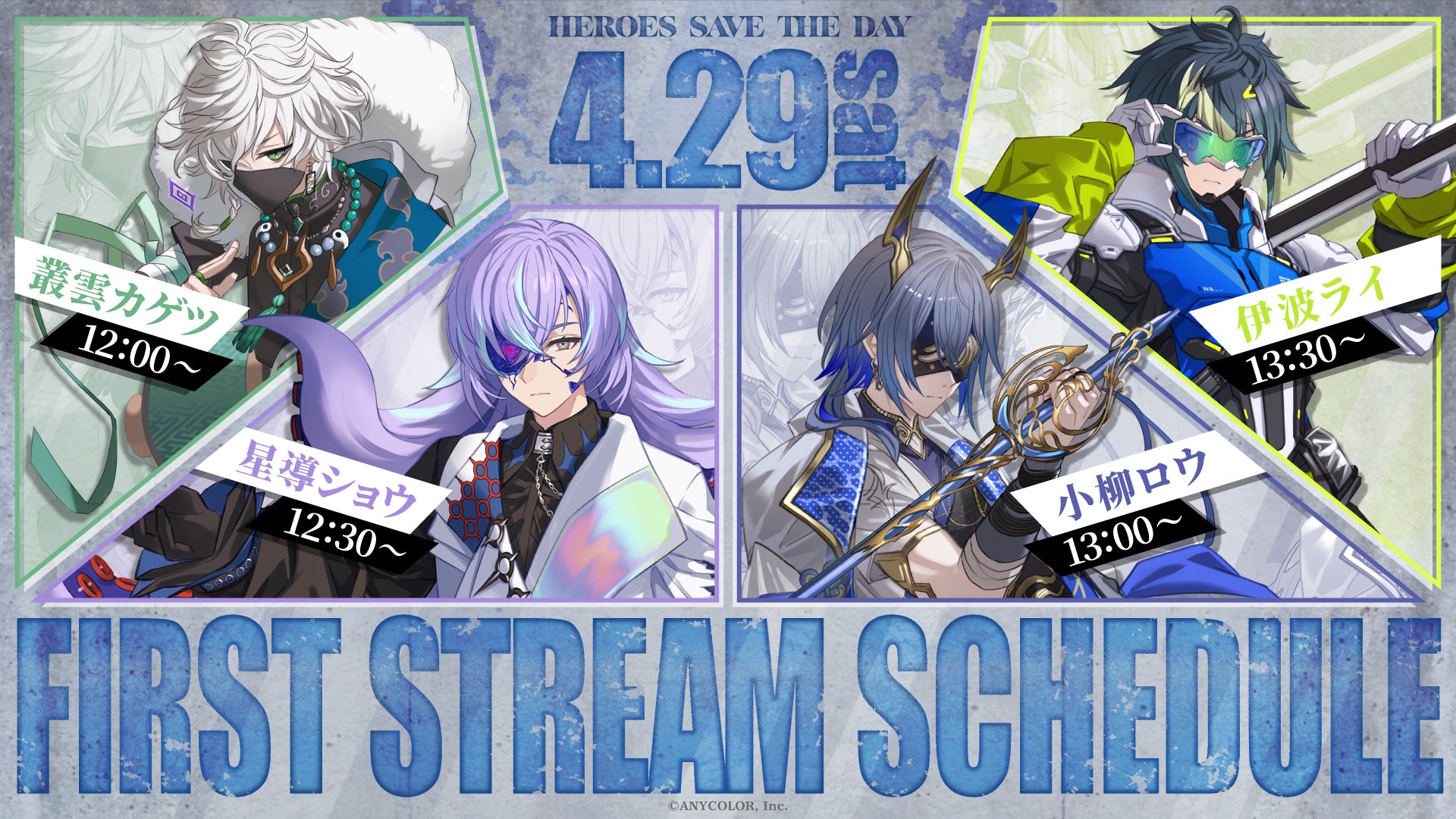 YouTubeでの初配信は各ライバーのチャンネルにて、2023年4月29日(土)12:00よりリレー形式で行います。ぜひ星導ショウ、叢雲カゲツ、小柳ロウ、伊波ライの初配信をご覧ください。