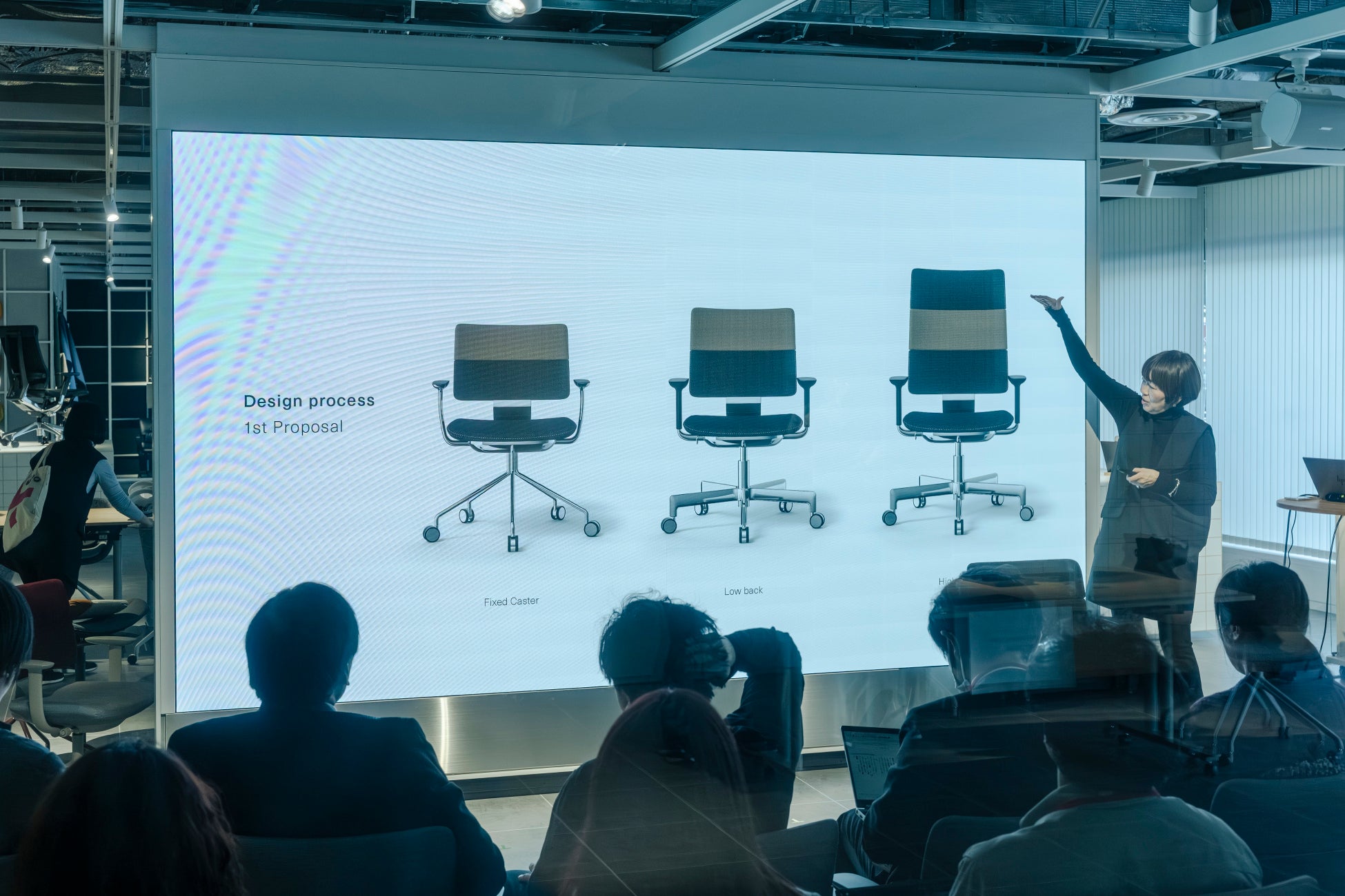 形状面では、ワークチェアが並んだ際に生まれがちな圧迫感を減らすため、首元の“抜け”をつくり、縦ラインではなく横ラインを意識して空間に広がりを出すことを初期から構想。さらに、企画側との対話の中で「昇降するキャスタータイプ」だけでなく、「昇降しないパイプ脚(ミーティングチェア的)」も含む3種展開へと発展した経緯にも触れ、「短い開発期間で三つを進めるのはすごいこと」と述べました。