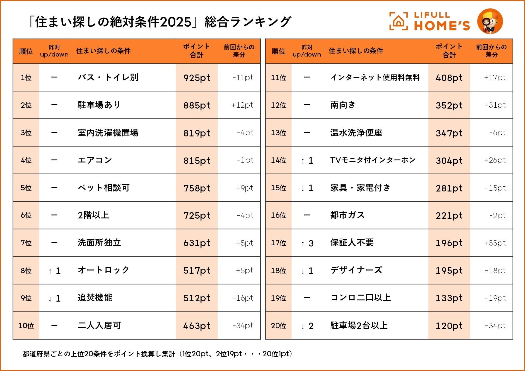 全国47都道府県ごとの必須条件のランキング上位20条件を1位から順に20pt、2位19pt…とし、条件ごとにポイントを集計しました。