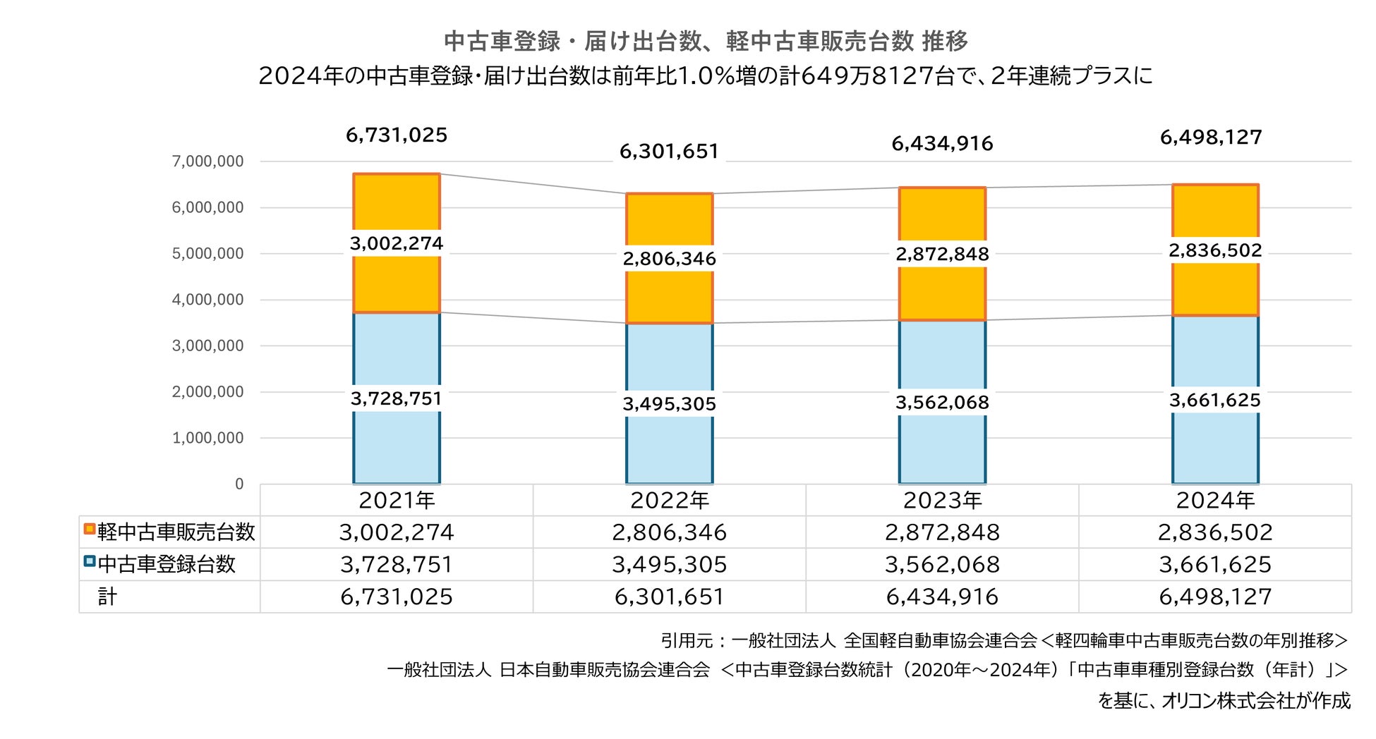 ■2024年の中古車登録・届け出台数は前年比1.0%増の計649万8127台で、2年連続プラスに
