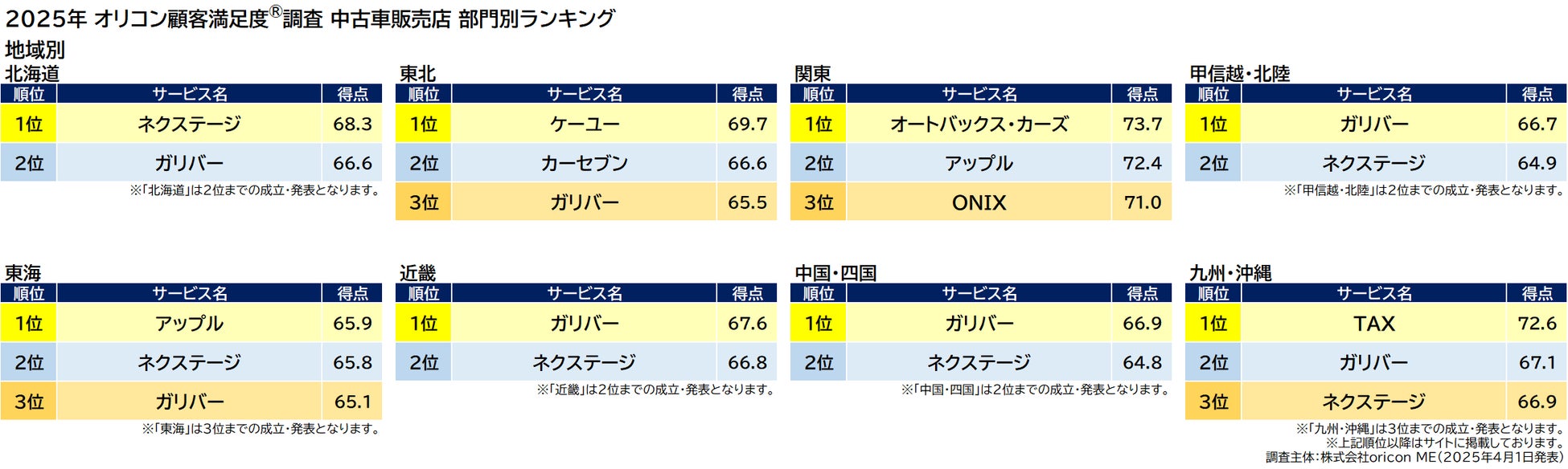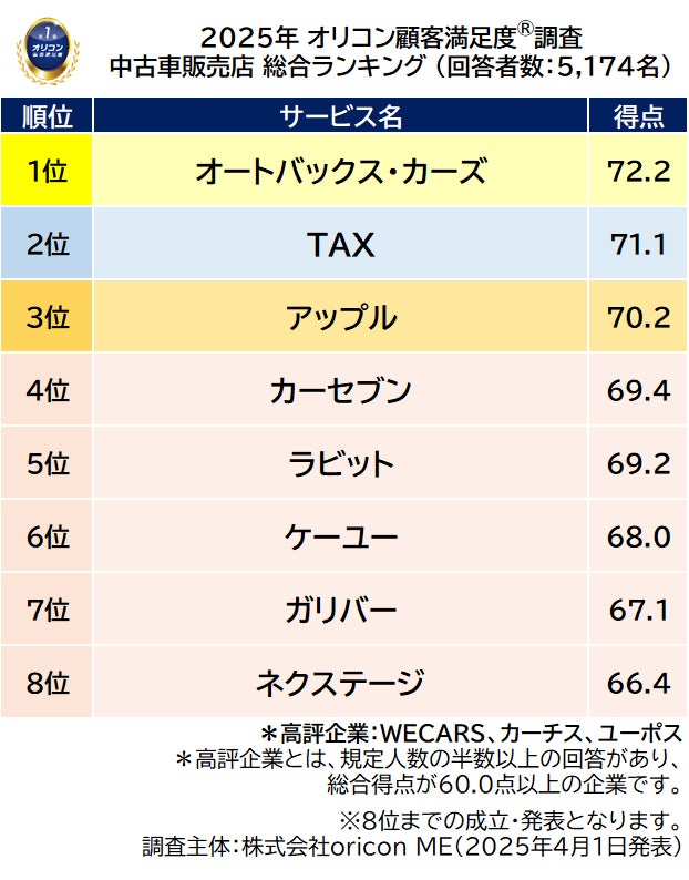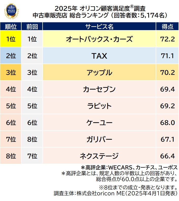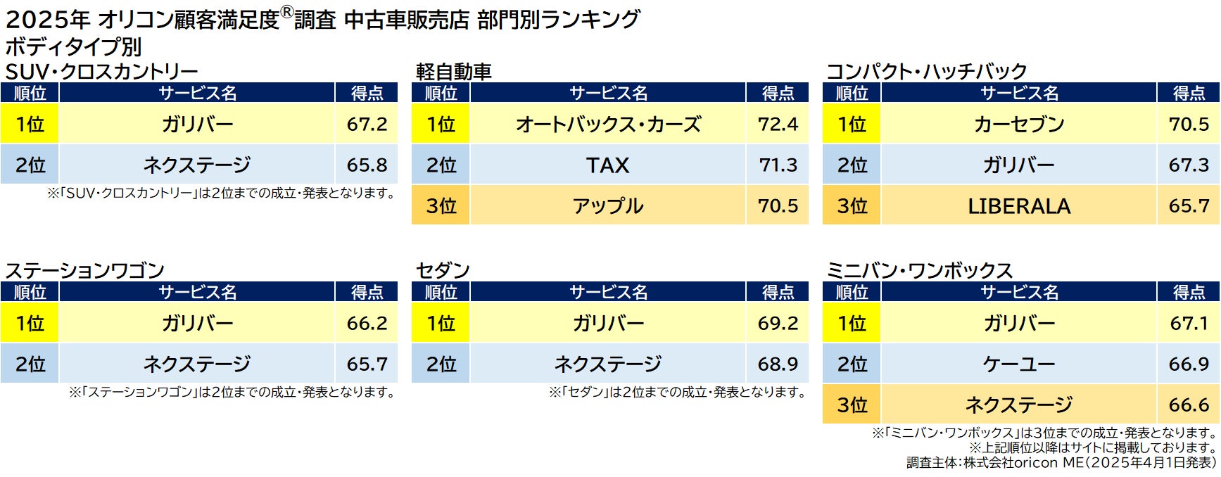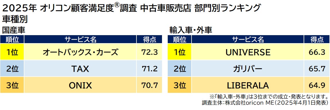 オリコン株式会社(本社:東京都港区 代表取締役社長:小池 恒、略称:オリコン)は、グループ会社である株式会社oricon MEが、実際のサービス利用者を対象に第三者の立場で実施した『中古車販売店』の顧客満足度調査の結果を、2025年4月1日(火)14時に「オリコン顧客満足度®」公式サイト内にて発表いたしました。ランキングの結果は下記の通りとなりました。