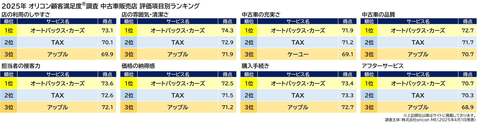 2025年 満足度の高い『中古車販売店』ランキング |【オートバックス・カーズ】が4年連続の総合・全評価項目1位(オリコン顧客満足度®調査)