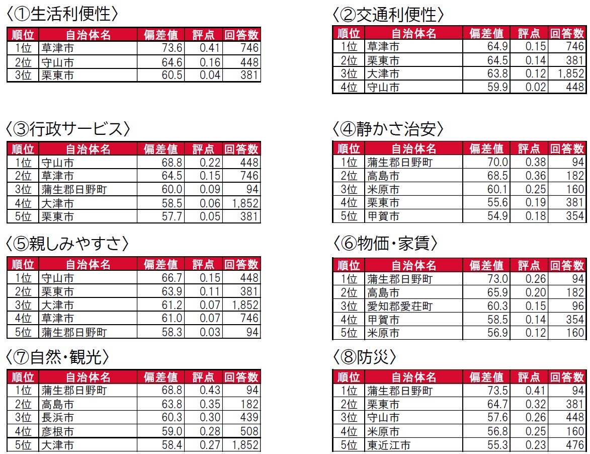 1位は、4年連続で駅前の商業施設が充実しており、交通の利便性も高い草津市が安定した高い評価を得る結果となっています。また、2位~5位も昨年と全く同じ順位です。