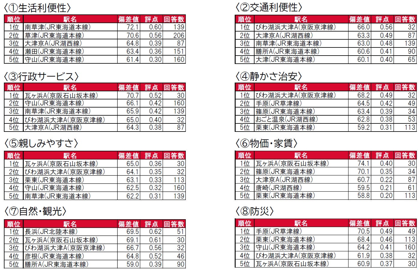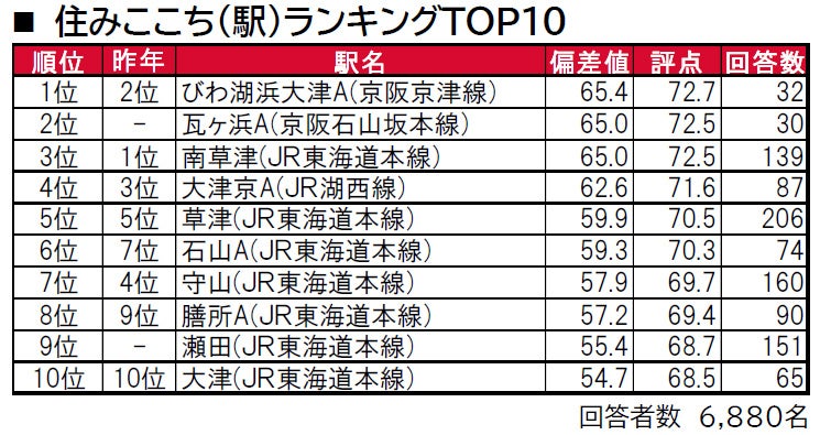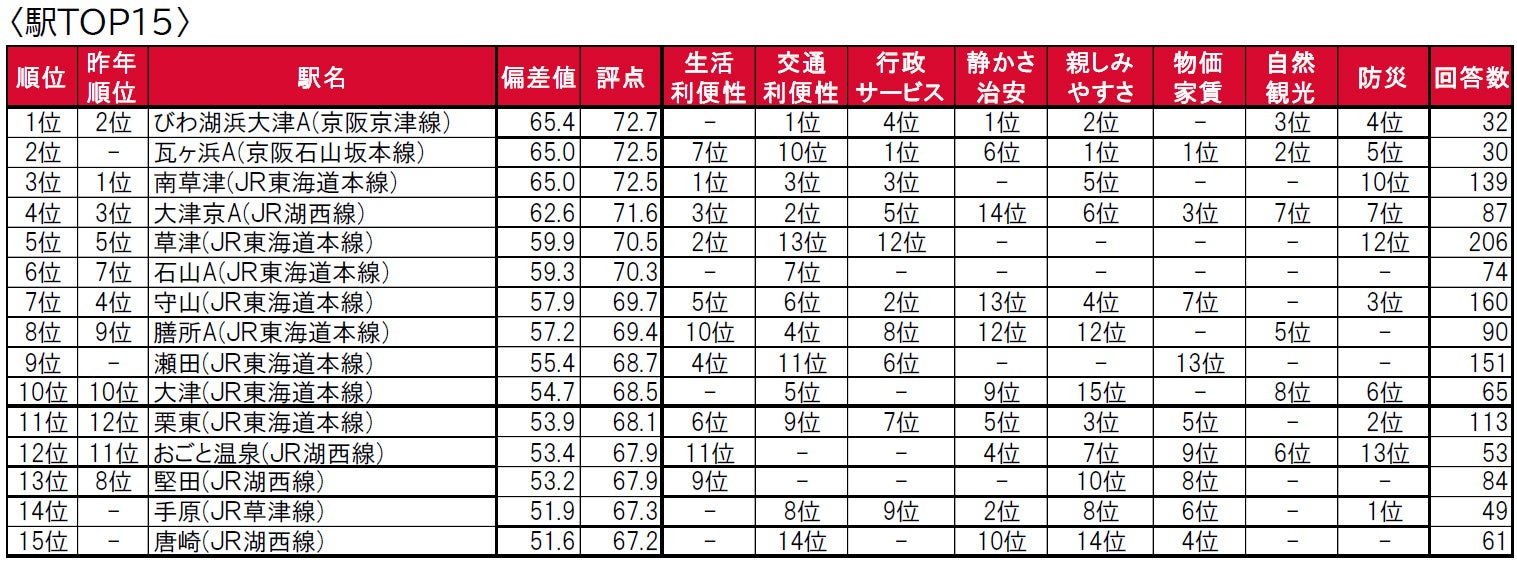 1位は、昨年は2位のびわ湖浜大津Aです。2位は、昨年は回答者数が30名に満たなかったため集計対象外だった瓦ヶ浜Aで、トップ2の駅はいずれも大津市にある駅です。3位は、昨年は1位の南草津という結果になっています。9位にランクインしている瀬田も、トップ2と同じく大津市にある駅です。