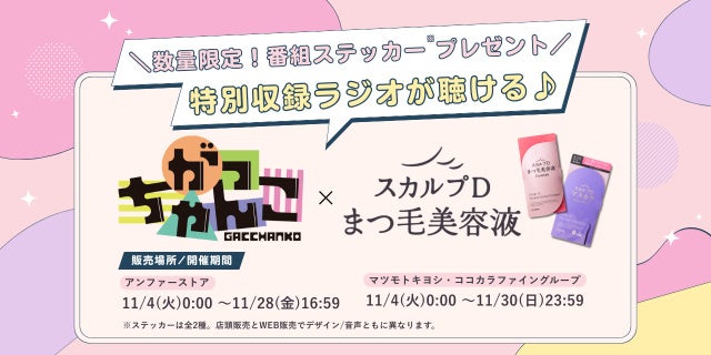 そして11月3日(月)~11月7日(金)の「がっちゃんこ」では、毎日「スカルプDまつ毛美容液」とのタイアップコーナーも実施します。各曜日の大人気コーナーが「スカルプDまつ毛美容液」コラボバージョンに!?ぜひ放送もお聴きください。