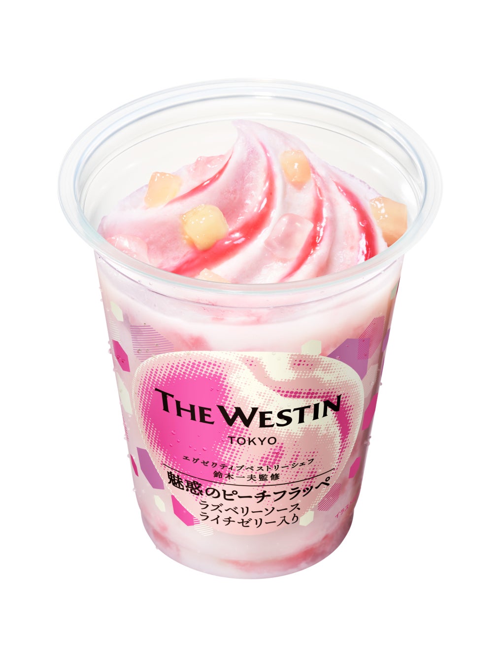 【内容】ウェスティンホテル東京のエグゼクティブペストリーシェフ鈴木一夫氏監修のもと開発したフラッペです。もも果肉ソース、ラズベリーソース、ライチゼリーを使用し、3種が織りなす味わいのマリアージュをお楽しみいただけます。