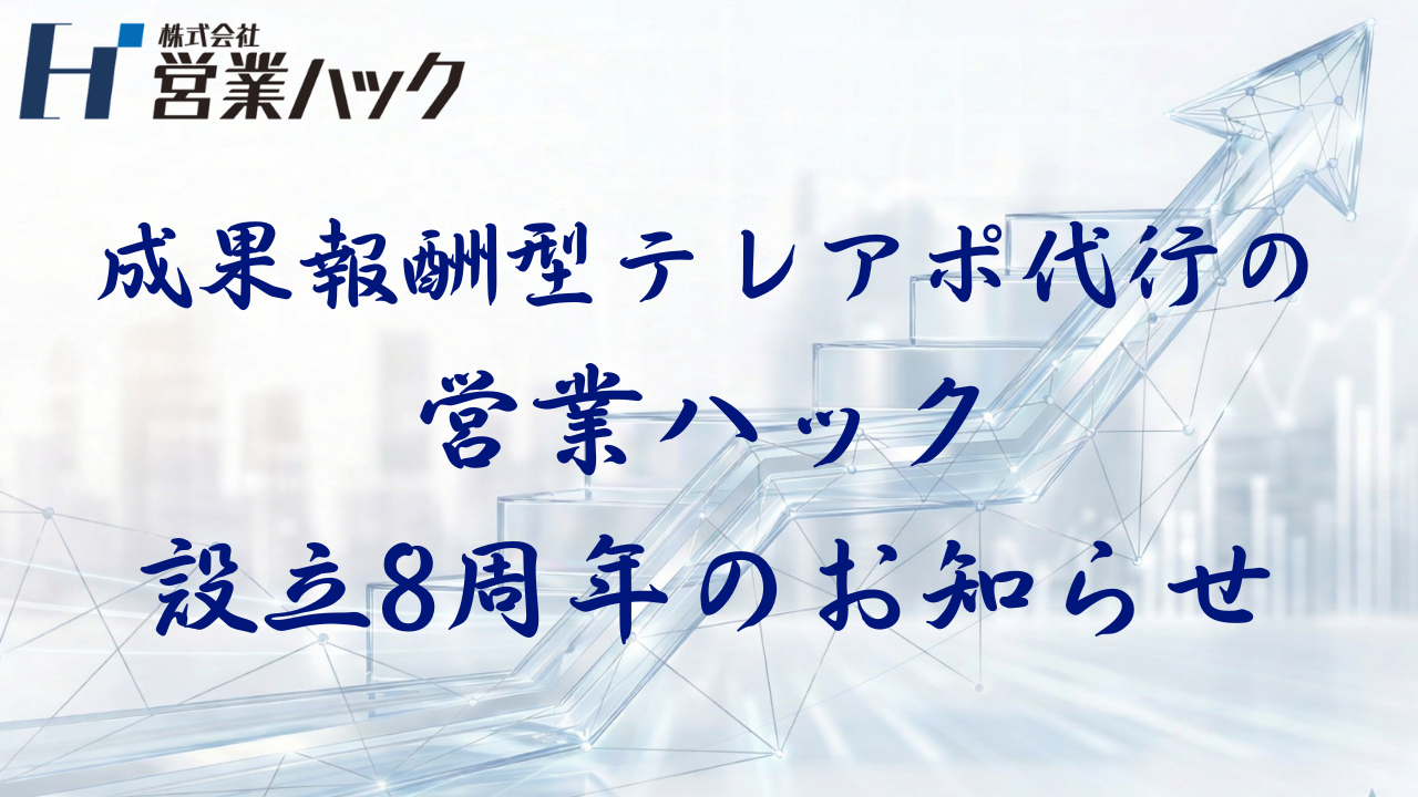 成果報酬型テレアポ代行会社として、営業の"再現性"に向き合い続ける株式会社営業ハック(本社:東京都中央区、代表取締役社長:笹田裕嗣)は、2026年4月13日をもちまして設立8周年を迎えることができました。ご指導・ご支援いただいた関係者のみなさま、誠にありがとうございます。ここにご報告いたします。2018年の創業以来、私たちは「営業の悩みをゼロにする」ことを掲げ、成果報酬型のテレアポ代行を軸に、多くの企業様の新規開拓をご支援してまいりました。