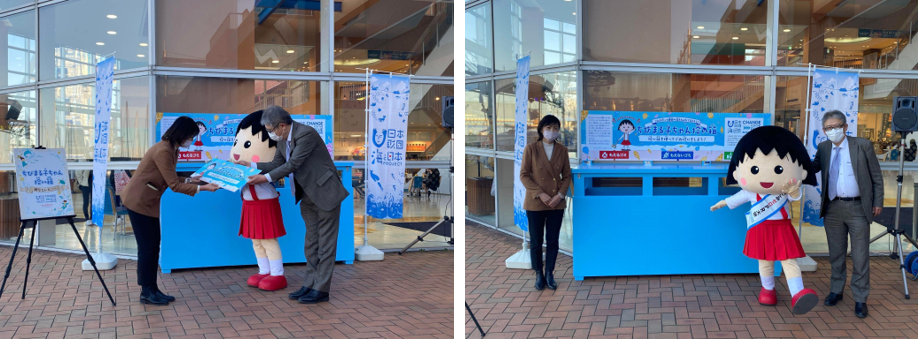 しずおか海洋ごみゼロ対策プロジェクト実行委員会は、同プロジェクトPR大使のちびまる子ちゃんをデザインした「拾い箱」を制作し、複合商業施設「エスパルスドリームプラザ」に設置する贈呈式を2022年1月22日に開催しました。