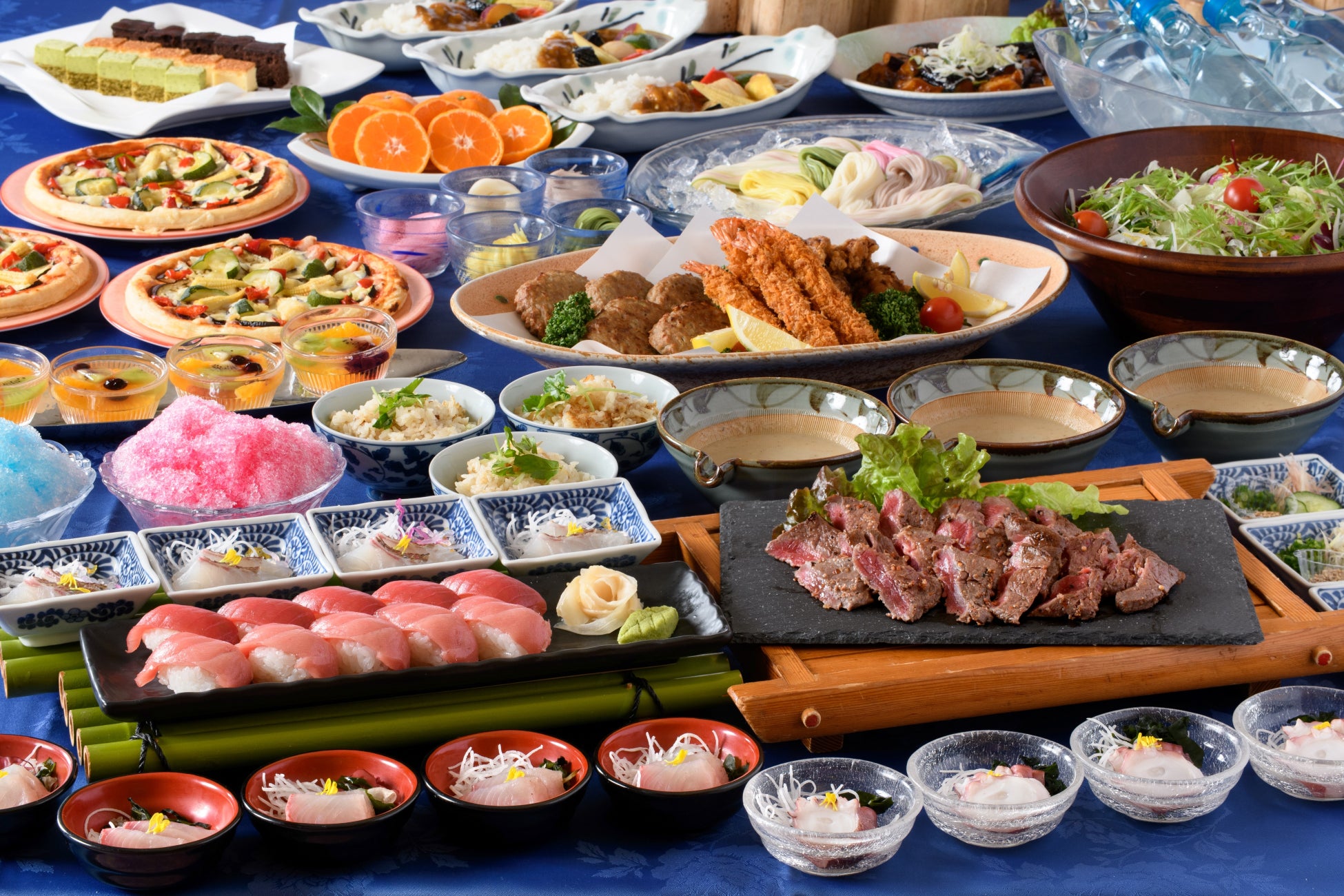 地元・愛媛をこよなく愛する料理長が県産食材を厳選。こだわり、愛を込めて仕上げたビュッフェです。瀬戸内海・宇和海産の新鮮な魚介や、豊かな自然の中で育てられた国産牛のステーキ、西日本最高峰の「石鎚山(いしづちさん)」の伏流水で育てた地元野菜、“柑橘王国えひめ”ならではのフルーツやスイーツ、そして松山名物やご当地グルメも勢ぞろい。