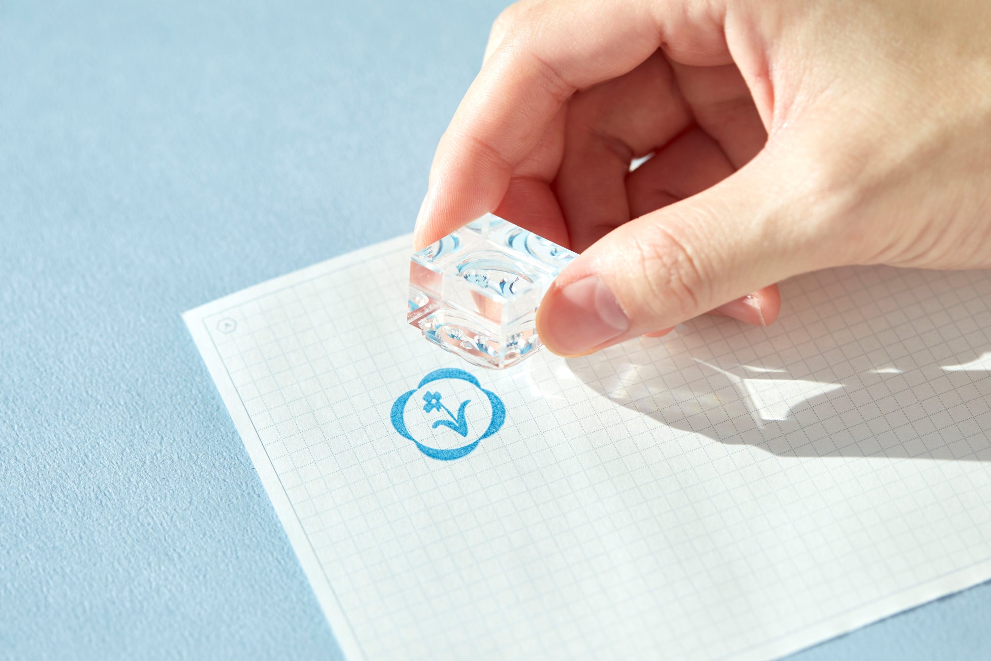 「氷印」は全てのパーツが透明素材で作られた、まるで氷のような見た目の透明スタンプです。本体と印面が透明なので、上から印面が見やすく、捺す位置を細かく調整できる機能性も兼ね備えています。持ち手はアクリル製なので、インクや汚れが付着しても簡単に拭き取ることができます。紙の裏側にインクがにじまないように塗りつぶし面を細かいドットで表現するなど、使用感にもこだわりました。