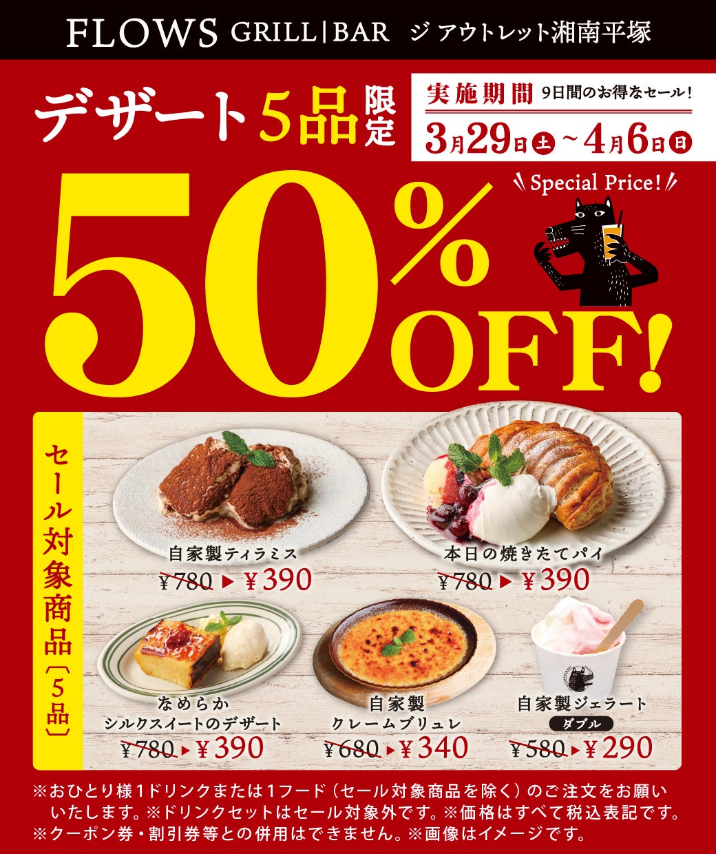 神奈川県平塚市にある、「FLOWS GRILL|BAR ジ アウトレット湘南平塚」で2025年3月29日(土)~4月6日(日) の9日間、日頃のご愛顧に感謝して「自家製ティラミス」や「自家製ジェラート」などデザート5品が半額でご利用いただけるセールを実施します。この機会に是非ご賞味ください。
