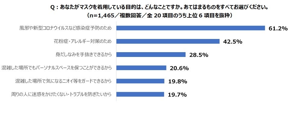 マスクの着用目的は、「感染対策」、「花粉症・アレルギー対策」「身だしなみ」、以外にも、「周りの人に迷惑をかけたくない・トラブルを防ぎたい」といった他者に配慮している方や、周りの人がマスクを着けているから着用するといった方もおり、目的が多岐にわたりました。