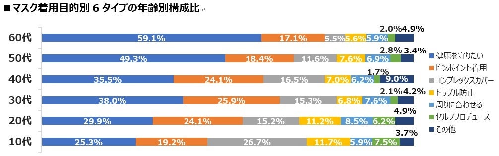 また、マスクを着用する目的の選択肢である全20項目を整理すると、着用目的は6タイプに分類され、年代別でも傾向が分かれることが分かりました。