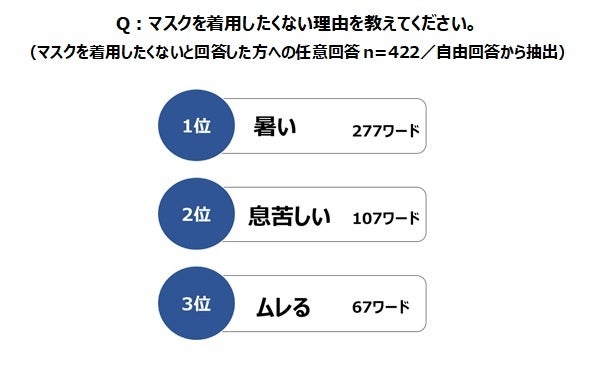 着用したくない方の理由は、「暑さ」という回答が最も多く、「息苦しさ」「ムレる」が続きました。この結果から、これから気温や湿度が上がるにつれて、マスクを着用されない人の増加が想定されます。