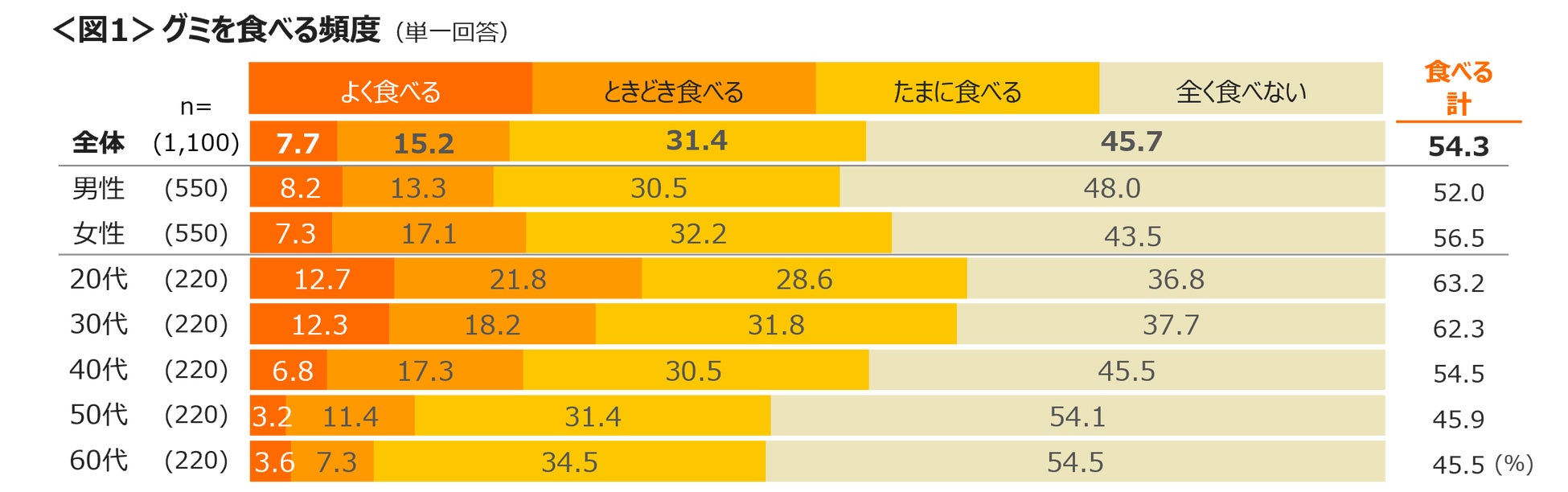 普段、グミを食べる人は54.3%と過半数を占め、そのうち「よく食べる」は7.7%。