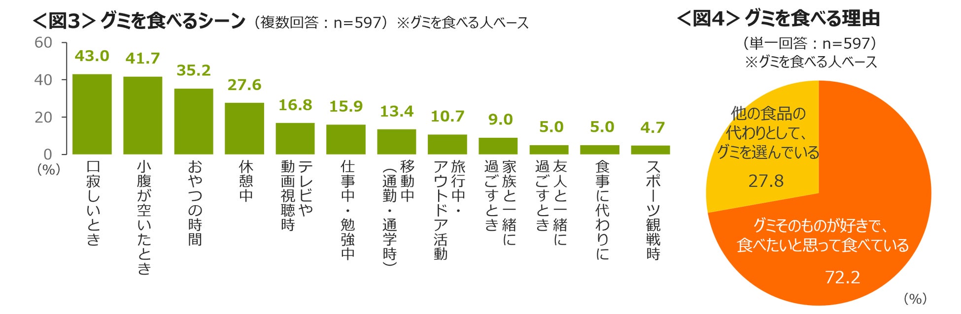 「グミそのものが好きで食べている」が7割、「他の食品の代わりとして、グミを選んでいる」が3割程度と、普段、グミを食べている人はグミ好きが多数派。<図4>