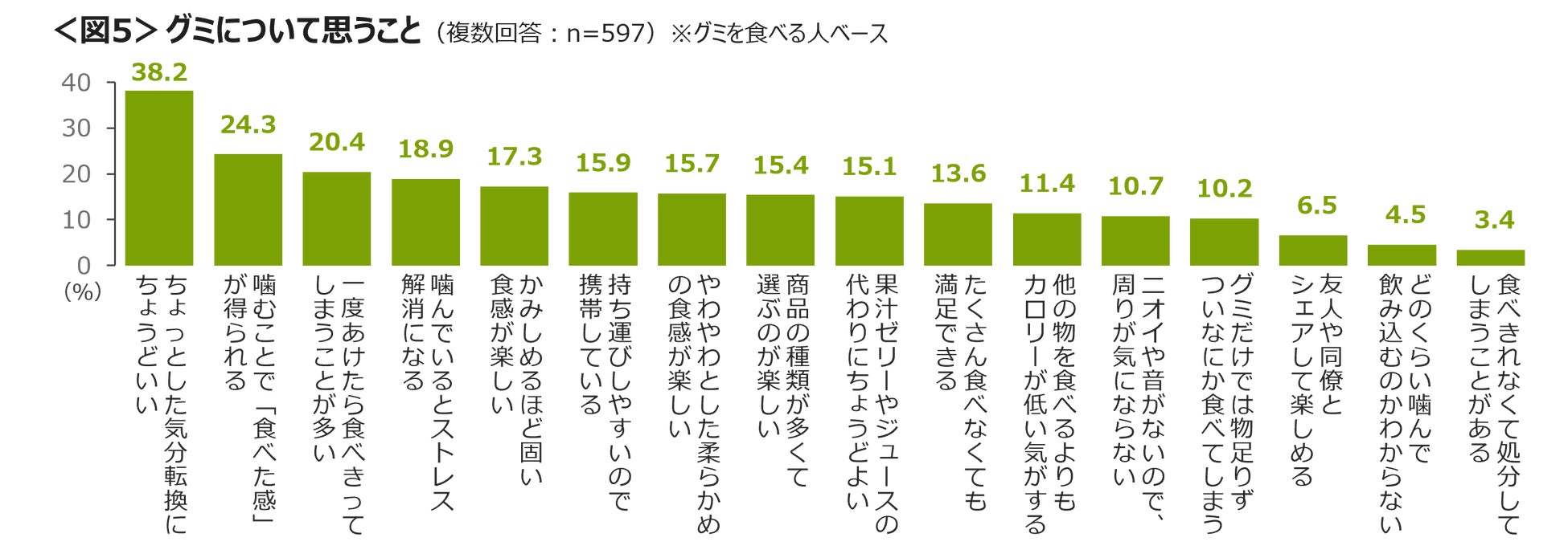 グミについて思うことは、「気分転換にちょうどいい」「噛むことで「食べた感」が得られる」が上位にあがる。<図5>