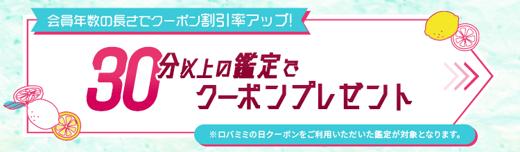 先着1,000名様に1回の鑑定で最大2,000円分の割引になるクーポンをプレゼントいたします。クーポンは、キャンペーン期間中にお1人様1回限り受け取ることができます。キャンペーン詳細ページ内(https://roba3.com/campaign/event236)の「クーポンをGETする」ボタンよりクーポンをお受け取りください。