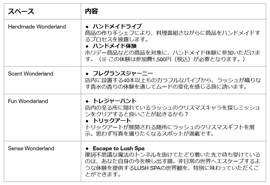 さらに、社会や環境を再生したり、社会における人や動物の権利を守る行動を起こし続けることで、化粧品業界から変革をもたらすべくコスメティックレボリューションを起こす力を持つ商品を開発し続け、化粧品のパッケージや広告ではなく、何よりも商品の中身にコストをかけ、お客様のベネフィットを最大限に考えた商品開発を継続しています。「LUSH MAGICAL WONDERLAND」は、人々の感覚を研ぎ澄ますショップ体験とともに、これらすべてのラッシュが提案する商品を存分にショーケースするスペースであり、来店するすべての方をハッピーな気分にするクリスマスの魔法をかけたラッシュのワンダーランドを体現したイベントです。