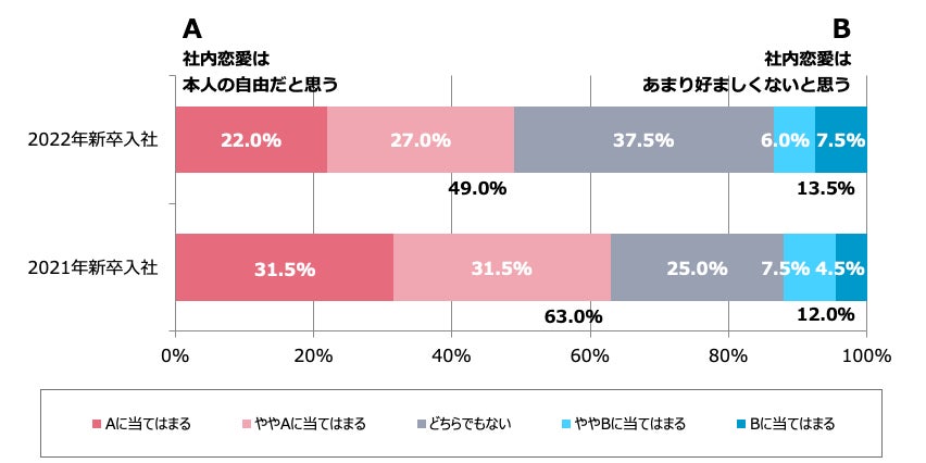 - 社内恋愛は本人の自由?2022年新卒入社は49.0%、1年先輩の昨年入社では63.0%