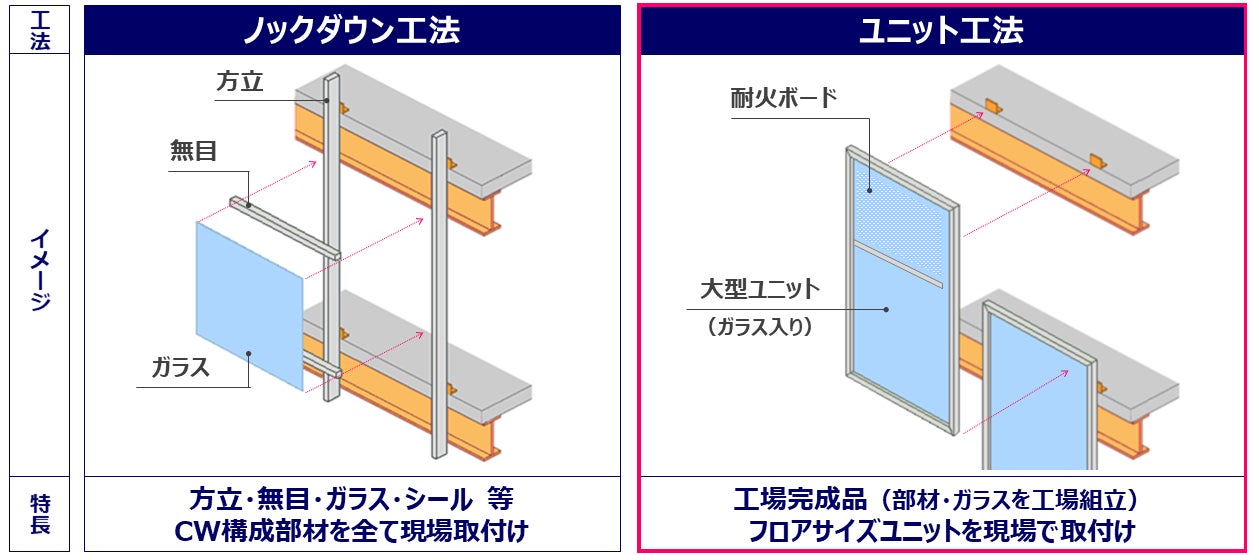 ※2:「ユニット工法」とは、工場で組み立てた完成品を現場で取り付ける工法。超高層ビルで一般的に採用される。