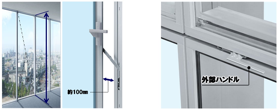 高さ2,700mmのフルハイトに対応し、大開口での換気窓の設置が可能です。また、換気時の開口幅を約100mmに制限することにより、安全性にも配慮しています。非常用進入口は、外部ハンドルの見付を極力抑えたスリムな形状とし、機能性を求める窓でありながら意匠性にも配慮しています。