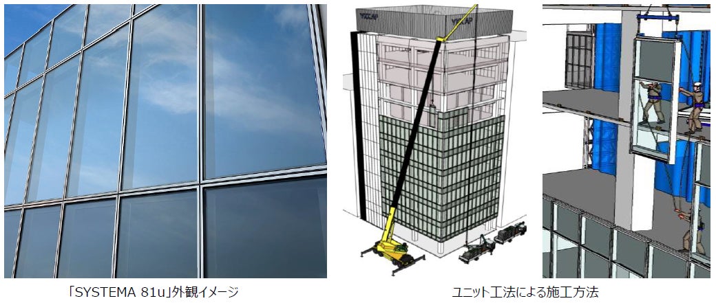 この「SYSTEMA 81u」は、工場で加工から組立・ガラス施工までを一貫生産した完成品ユニットを現場へ搬入します。完成品ユニットをクレーンで吊り込んで施工するため外部足場が不要であり、またガラス施工も無いため、工期を約1/3(※4)に短縮でき人手不足の課題解決に貢献します。高意匠商品「SYSTEMA」シリーズの特長である“軽快な意匠”・“明快な機能”を踏襲しつつ、基本3性能(耐風圧・気密・水密)に加え、都市部で必要となる防火設備にも対応します。