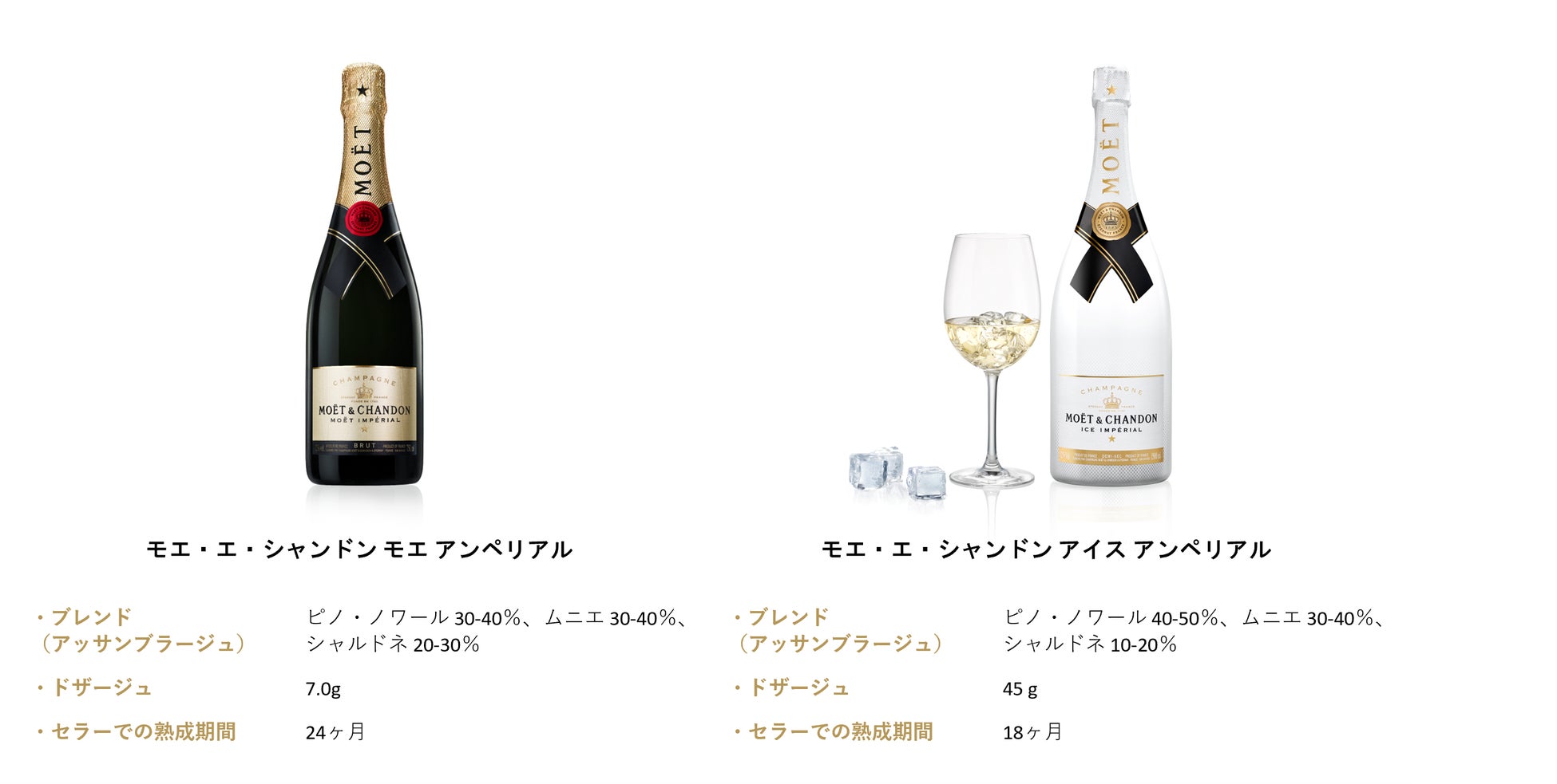 モエ・エ・シャンドンは、国王ルイ15世当時のフランス宮廷の御用達ワインとして親しまれ、かのポンパドゥール夫人は、”飲んだあと女性をより美しくしてくれるのはシャンパンだけ”と断言しました。またロシア皇帝アレキサンドル1世、フランス国王シャルル10世などもメゾンを寵愛し、特にナポレオン1世と当時の当主ジャン・レミーとの間には深い友情があり、メゾンのフラッグシップ・シャンパン「モエ アンペリアル」は、ナポレオン1世への敬意を表し『アンペリアル(皇帝)』と名付けられました。モエ・エ・シャンドンは、シャンパーニュ地方最大の作付面積を有し、上質なブドウ、長年培ってきたシャンパン造りのノウハウ、そして近代的な設備を活かし、1743年の創業以来約3世紀もの間、代々の醸造家が完成させてきたサヴォワ・フェール(職人の匠)を受け継いでいます。また、サステナブルプログラム「ナチュラ・ノストラ」 を通じてシャンパーニュ地方の生物多様性の保護に努めており、2009年からは慈善活動プログラム「Toast for a Cause」も行っています。代表的なモエ・アンペリアルから希少なグラン ヴィンテージ コレクション、また爽やかなアイス アンペリアルや優しい味わいのネクター アンペリアルとそれぞれの個性はどれも親しみやすく、幅広い味わいはあらゆるシーンでお楽しみいただけるシャンパンとして世界中の人々を魅了し続けています。