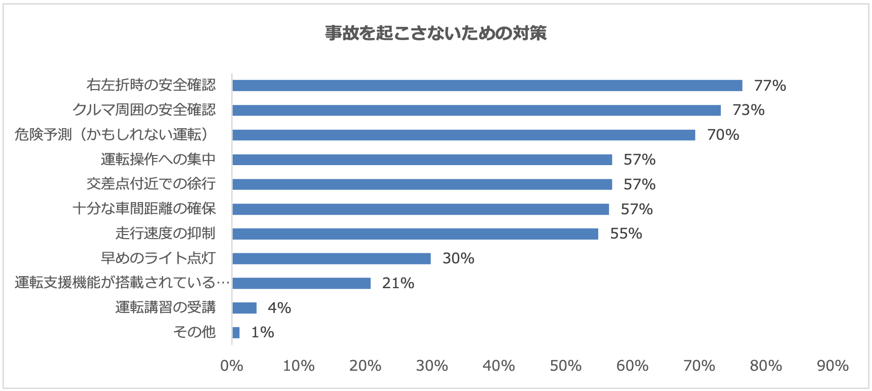事故を起こさないための対策は、1位「右左折時の安全確認」77%、2位「クルマ周囲の安全確認」73%、3位「危険予測(かもしれない運転)」70%でした。