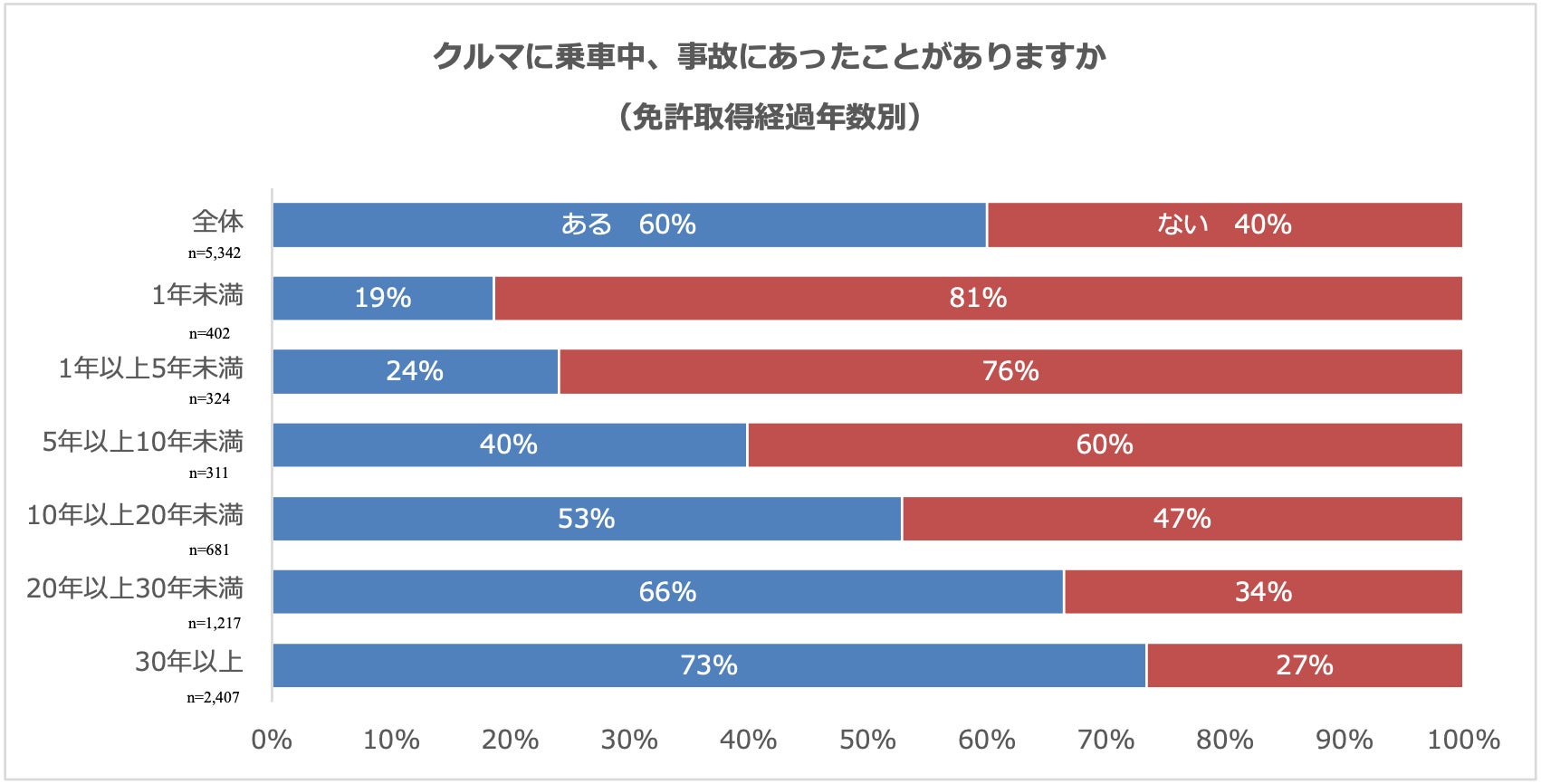 クルマに乗車中、事故にあったことがある人は60%となりました。免許取得経過年数別で見ると、1年未満はおよそ5人に1人、10年以上経過している人は半数以上が事故にあっています。