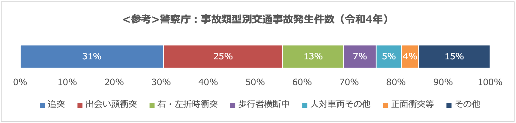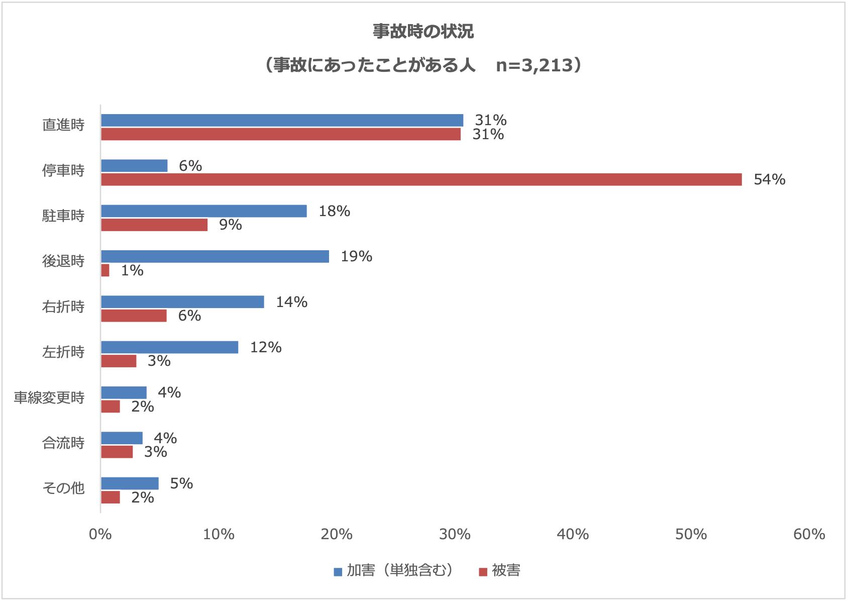 事故にあったときの状況を見ると、加害(単独含む)側は「直進時」31%が最も多いのに対し、被害側は「停車時」54%がダントツで、そのほかの項目より23pt以上高くなりました。警察庁が発表している令和4年の交通事故件数でも「追突事故」が最も多くなっており、右左折やバックといった複雑な運転操作が必要ない「直進時」も、十分な注意が必要であることがわかる結果となりました。