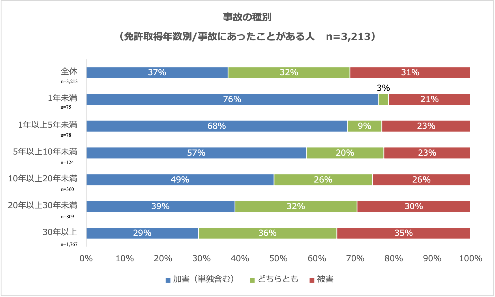 事故にあったことがある人に事故の種別を聞くと、「加害(単独含む)」37%、「被害」31%、「どちらとも」32%という結果となりました。免許取得経過年数別で見てみると、免許を取得してからの年数が短い人ほど「加害(単独含む)」の比率が高くなっています。