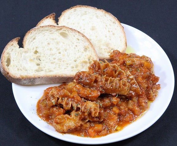 イタリア料理の定番であるトリッパ(牛ハチノス)を太陽のトマト麺スタイルで。軽くトーストしたバゲットとオリーブオイルを添えれば、おうちでバル気分が楽しめます。