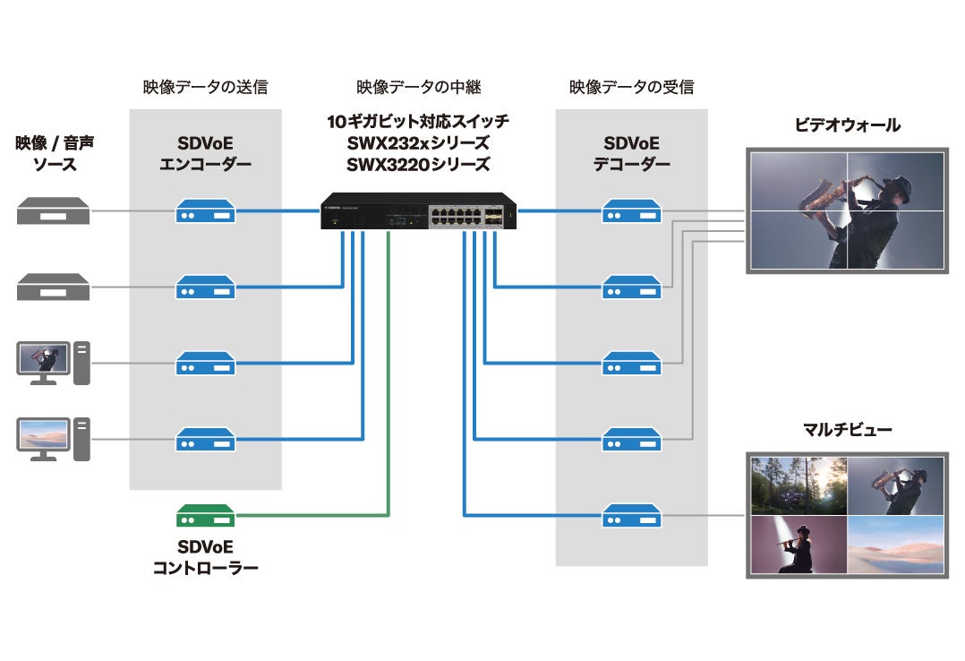 そして今回、音声伝送だけでなく、高品質な映像・音声両方のインフラが求められる法人向けのPro AV/IT業界に向けて、信頼性とコスト効率の高いソリューションを実現するために、「SDVoEアライアンス®」※1に加盟し、ネットワークスイッチ4モデル(「SWX2320-16MT」「SWX2322P-16MT」「SWX3220-16MT」「SWX3220-16TMs」)が「SDVoE™」規格※2に対応※3しました。当社のネットワークスイッチと映像ソース機器、大型モニターなどの業務用機器を組み合わせることで、高品質な映像・音声の長距離伝送を実現します。