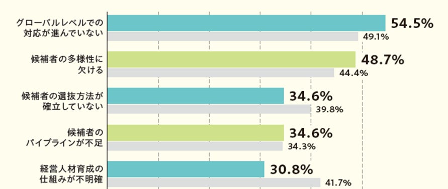 もう1つ紹介します。次世代リーダー発掘・育成の課題を聞いたところ、最も深刻だったのが「グローバルレベルでの対応が進んでいない」でした。全体では54%の回答を集め、前回調査(49%)を上回りました。なかでも製造業だけでみると71%と、非製造業(36%)よりも高い傾向にありました。また従業員数が多い企業ほど、「グローバルレベルでの対応が進んでいない」ことを課題と受け止める比率が高くなりました。3000人未満(33%)、3000~1万人未満(57%)に対して、1万人以上(62%)という結果でした。国際情勢が読みにくい時代だからこそ、グローバル展開を迫られる大手の危機感が表れています。