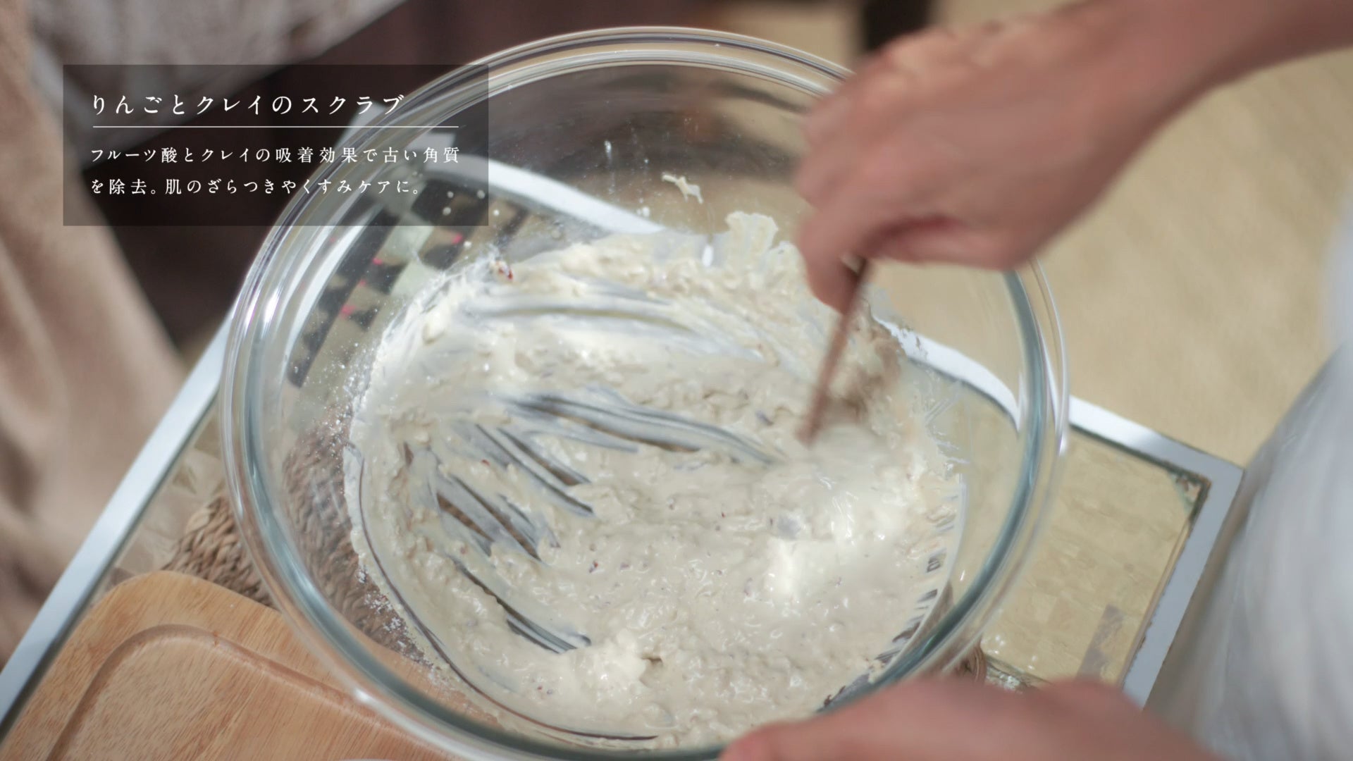 リンゴ、ヨーグルト、ホホバオイルを使用して作る泥のスクラブ剤。リンゴは皮のまますりおろし、クレイ、ヨーグルト、ホホバオイルを混ぜ合わせます。フルーツ酸と泥の吸着効果で古い角質を除去。肌のざらつきやくすみケアにおすすめです。