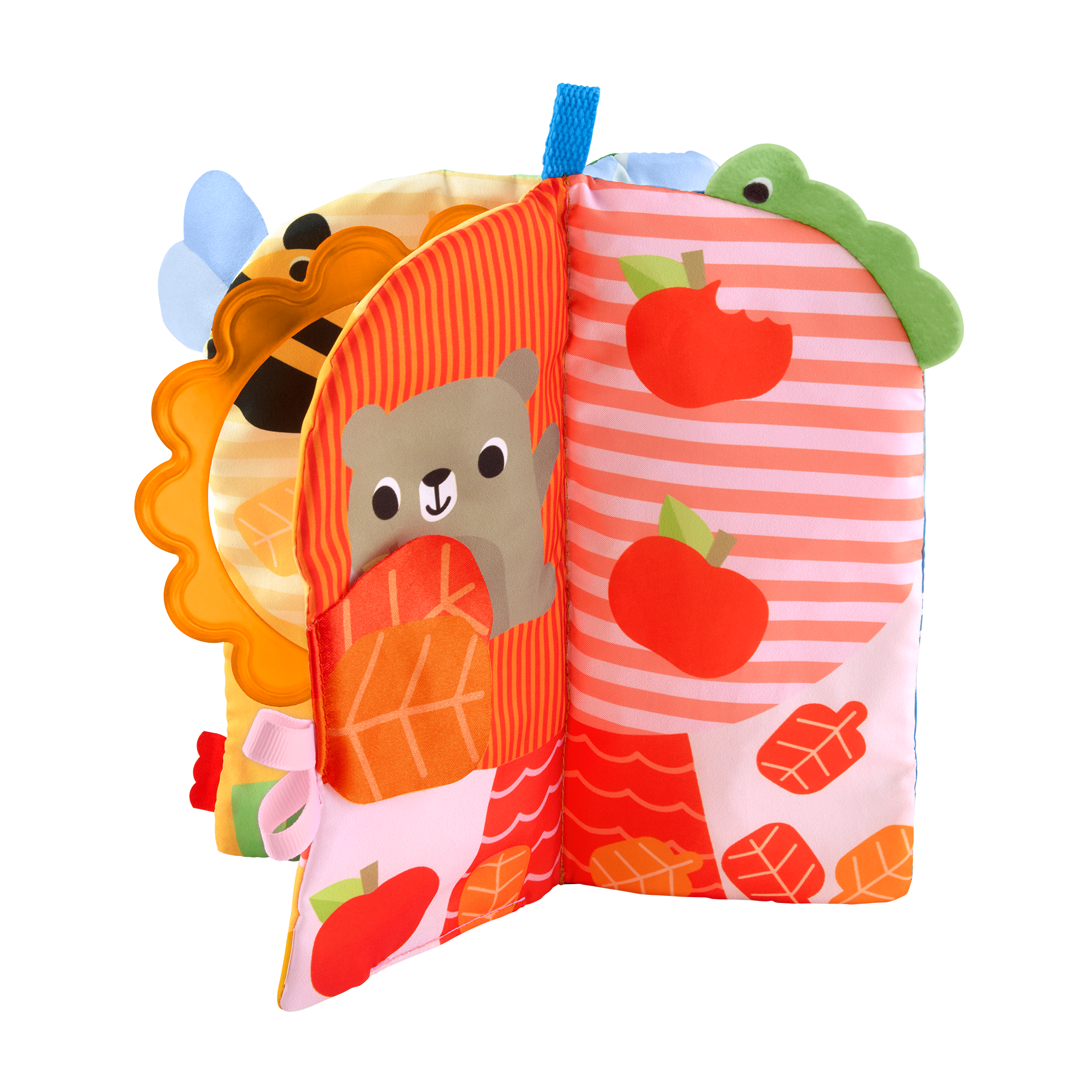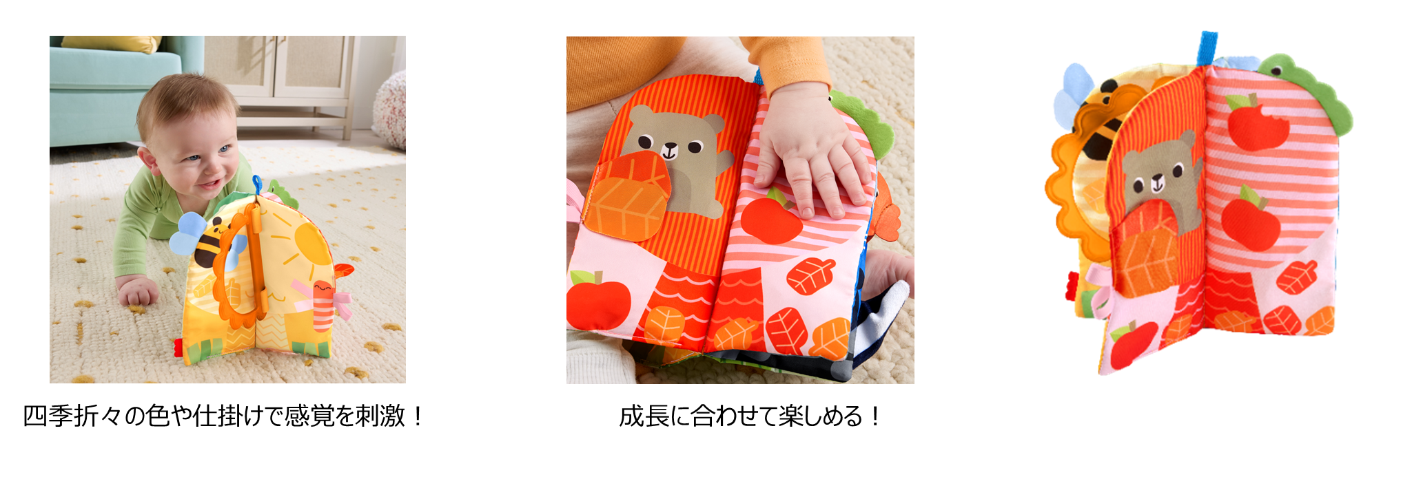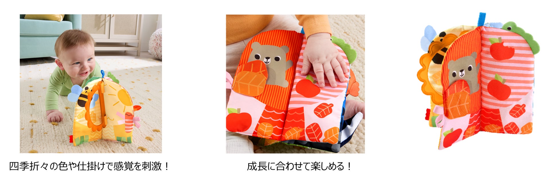 遊びながら春・夏・秋・冬の季節に親しめるソフト絵本です。それぞれの季節をイメージしたページには、かわいらしいキャラクターや多彩なしかけが用意されており、見て、触れて、動かして楽しむことができます。カラフルなデザインや異なる手ざわりが、赤ちゃんの視覚や触覚を刺激し、遊びながら学びを深めます。ブックは立てて置くことができるため、腹ばい期の赤ちゃんが体を起こす練習にも役立ちます。また、おすわり期には横にして置くことで、自分でページをめくりながら遊ぶ楽しさを広げることができます。握りやすいハンドルが付いているため、持ち運びもしやすく、おでかけ先でも楽しく遊べます。
