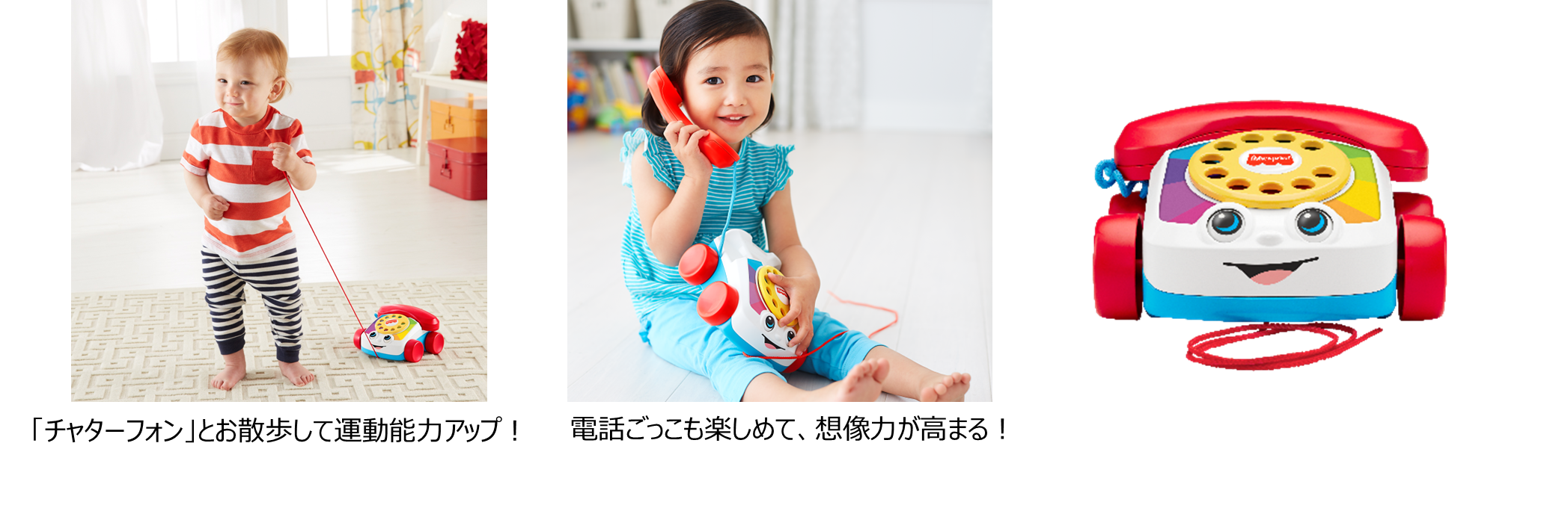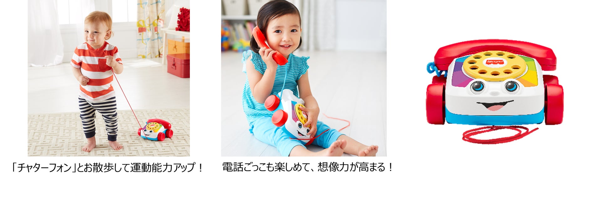 1961年より長く愛され続けているベストセラー玩具「チャターフォン」が、日本に再上陸します。電話を引っ張って一緒に歩いたり、電話ごっこ遊びを楽しんだりと様々な遊び方が可能です。ダイヤルを回すと楽しい音が鳴り、本体を引いて転がすと目がきょろきょろと動きます。楽しい動きやしかけが子どもの好奇心を引き出し、運動能力や想像力・創造力の成長をサポートします。また、明るく鮮やかなカラーリングが感覚を刺激し、夢中になれる時間を届けます。