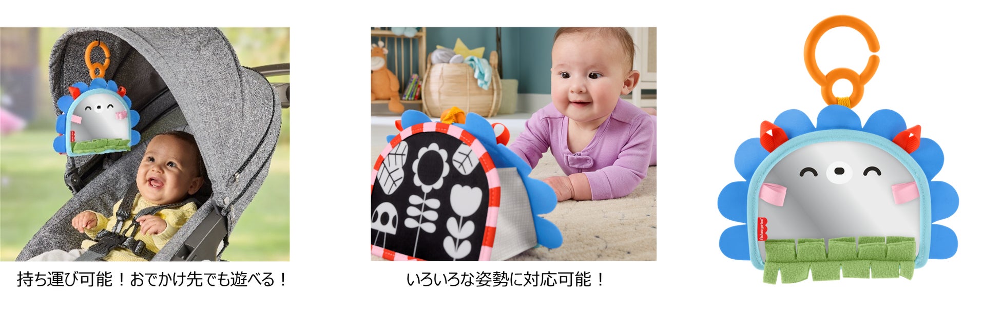 かわいらしいハリネズミの本体には、自分の姿を映して楽しめるミラーと、さまざまな手ざわりを楽しめる飾りが付いている知育おもちゃです。おうち遊びはもちろん、吊り下げパーツでベビーカーやバッグに取り付けておでかけ先でも楽しく遊べます。白黒のハイコントラストパネルは、赤ちゃんの視覚を刺激し、発達をサポートします。ミラーは折りたたんだり、広げて立てたりできるため、腹ばいの姿勢でも興味を持って遊ぶことができます。