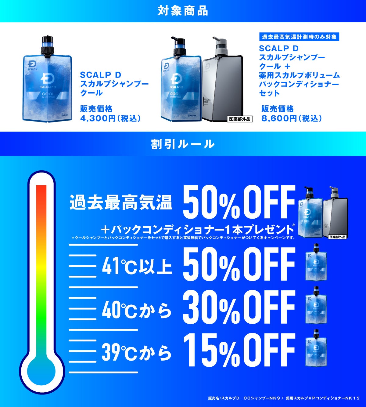 【猛暑割】史上最恐!?レベルの猛暑の夏をお得に涼しく楽しもう! 暑ければ暑いほど、SCALP D史上最高冷感※1の「SCALP D クール」が割引に!史上最高気温観測で50%オフ!