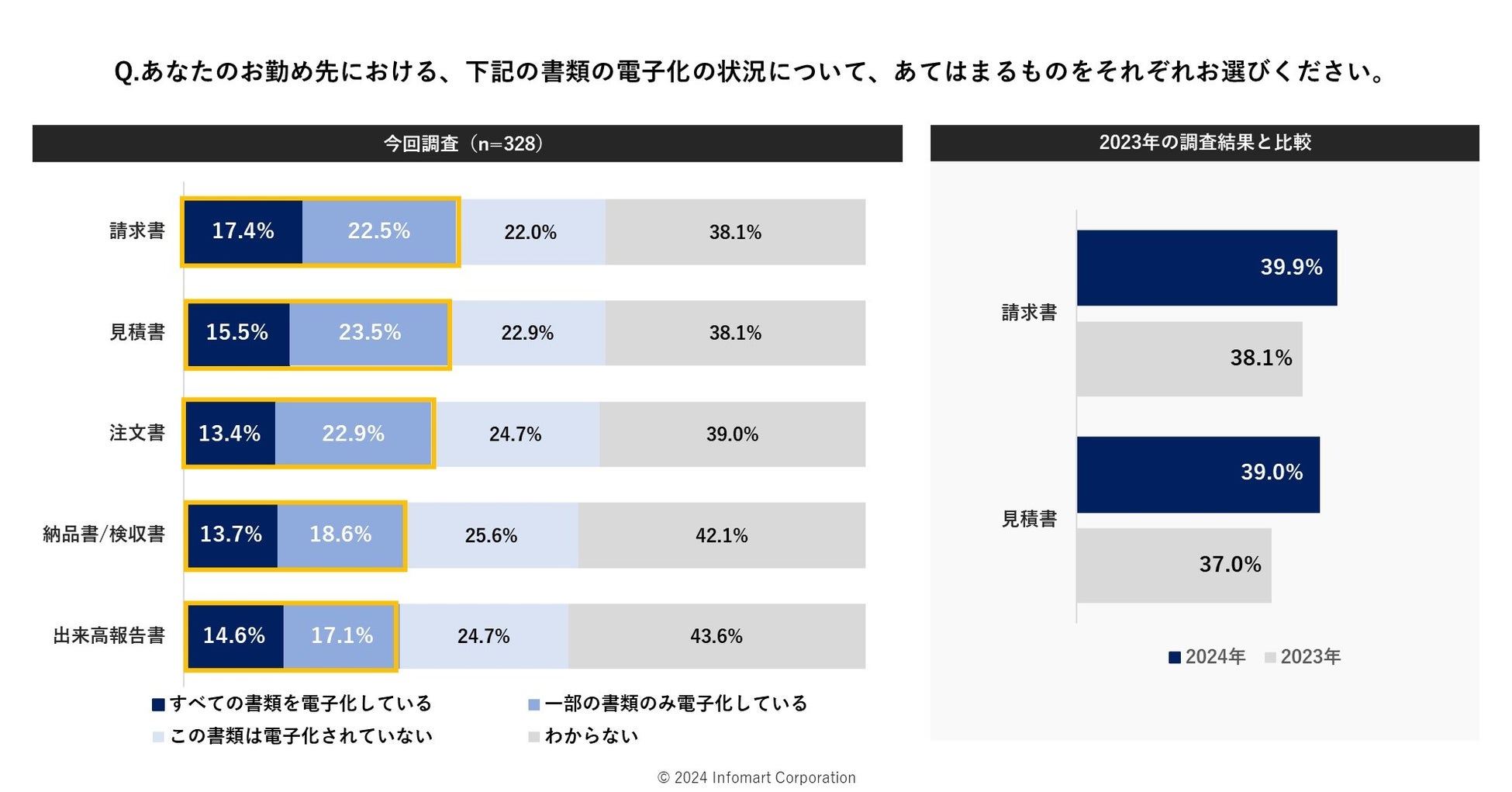 続いて、各種書類の電子化の状況を聞いたところ(n=328)、4割弱が「請求書」「見積書」を「すべて/一部を電子化している」と回答しました。請求書、見積書ともに2023年の調査から電子化している割合が増えており、電子化が進んでいると推測できます。